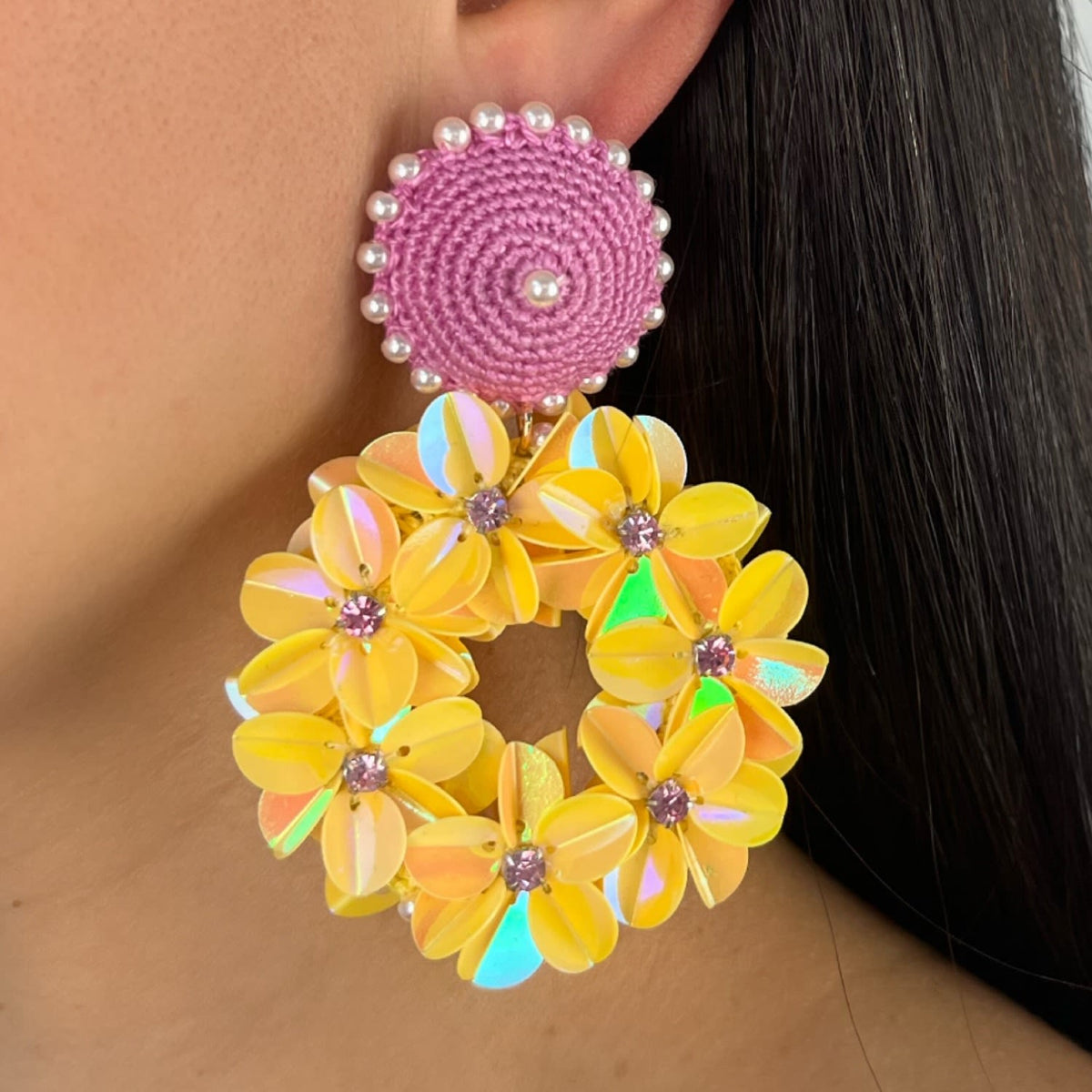 These hoop earrings are handcrafted. The materials are not explicitly stated beyond the mention of "fine crochet work". The color is Yellow.