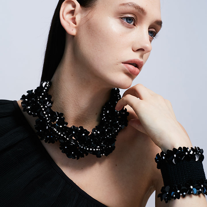 This Yasmine Cuff by Pinar Ozevlat is a bold and feminine piece inspired by the jasmine flower, symbolizing love, purity, and sensuality. The cuff features big personality and texture, conveying the beauty of fine crochet work with heavy cotton thread and delicate pearls. This is a signature, handcrafted piece that makes a powerful statement while remaining elegant and modest.