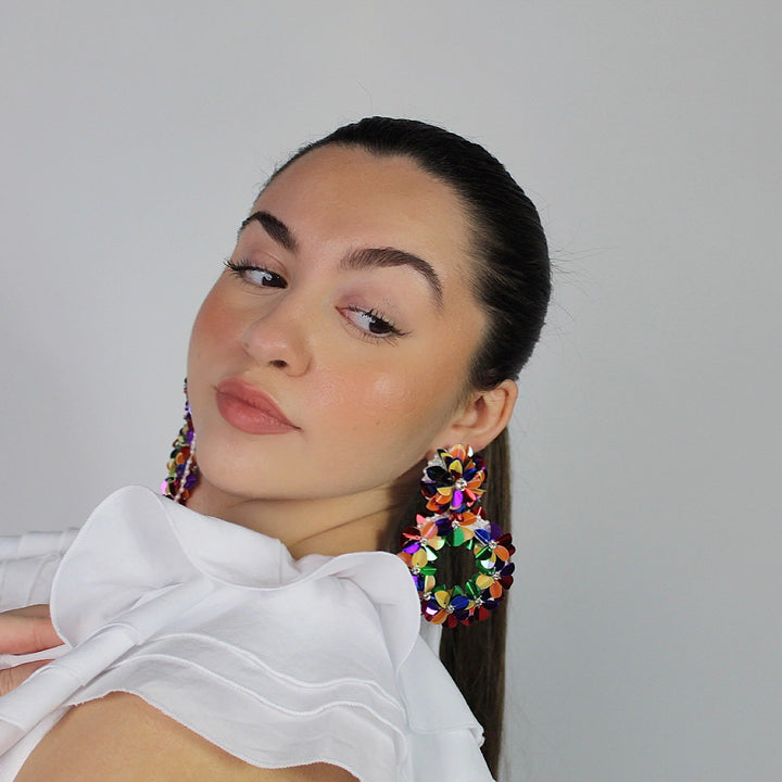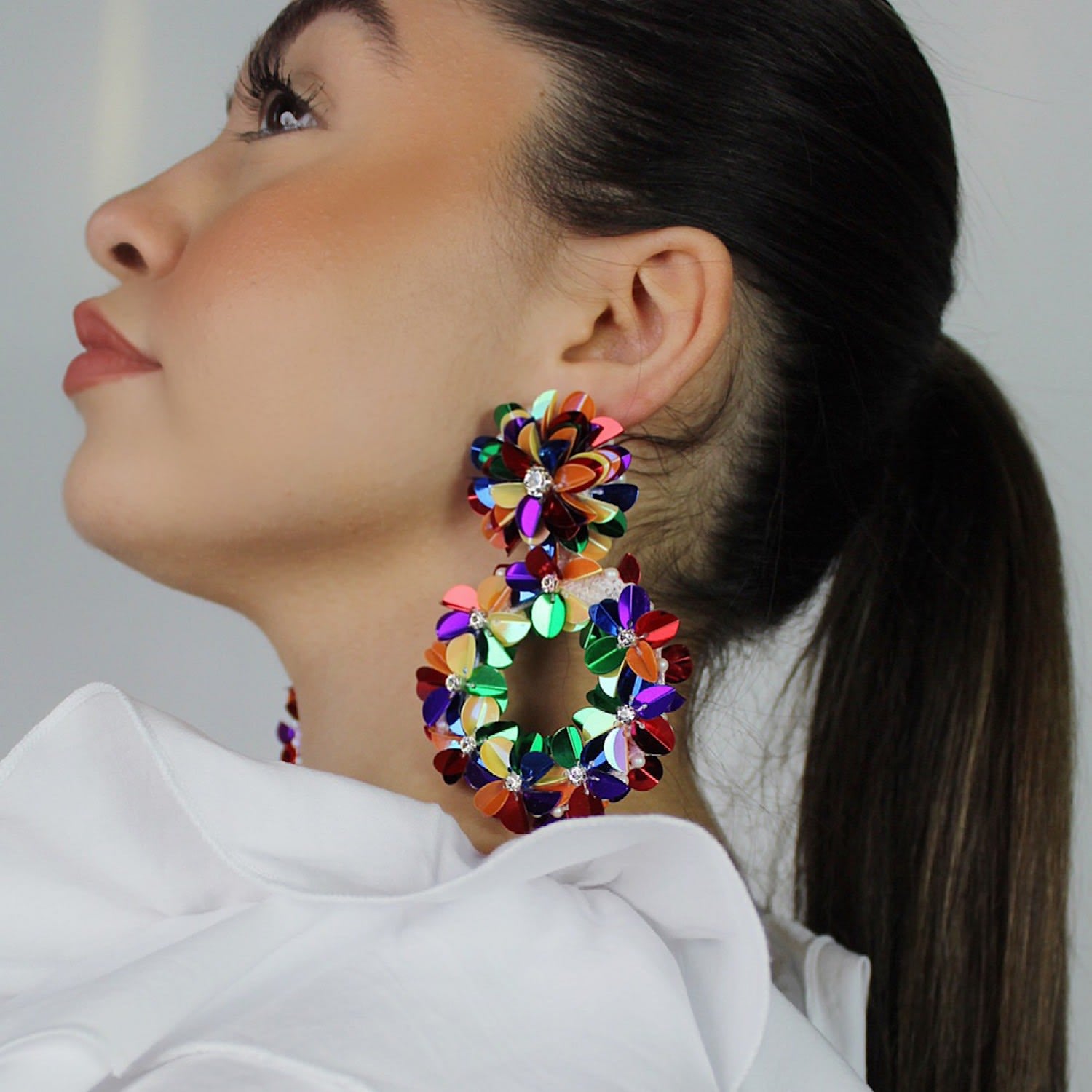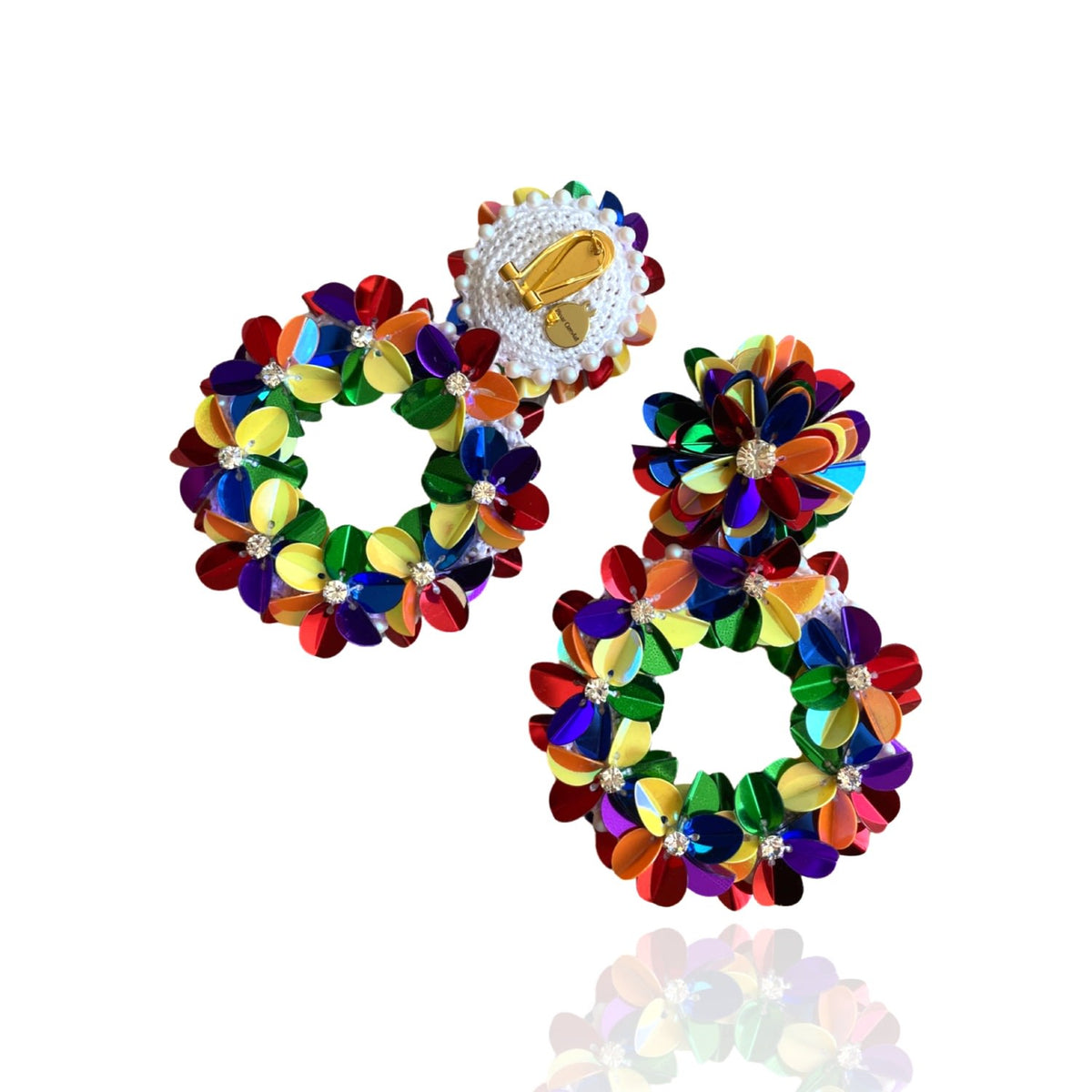 These Rainbow Yasmine Hoops by Pinar Ozevlat are a bold, feminine, and colorful statement piece. Inspired by the jasmine flower, which symbolizes love and feminine powers, these hoops are an absolute showstopper. They feature pearl cotton thread, sequins, Preciosa crystals, and Swarovski pearls, making them a fun and attractive accessory for a beach party or a night out.