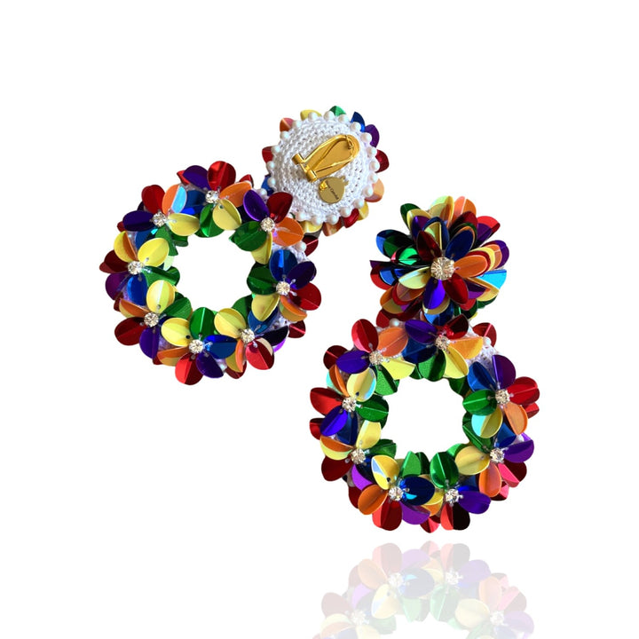 These hoop earrings are made of gold-plated brass with pearl cotton thread, sequins, Preciosa crystals, and Swarovski pearls. They have an omega post.