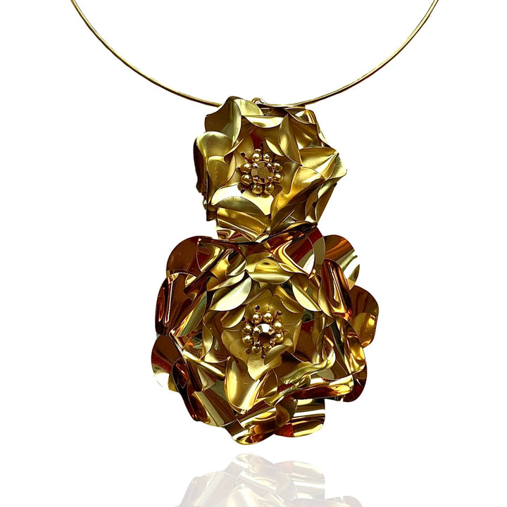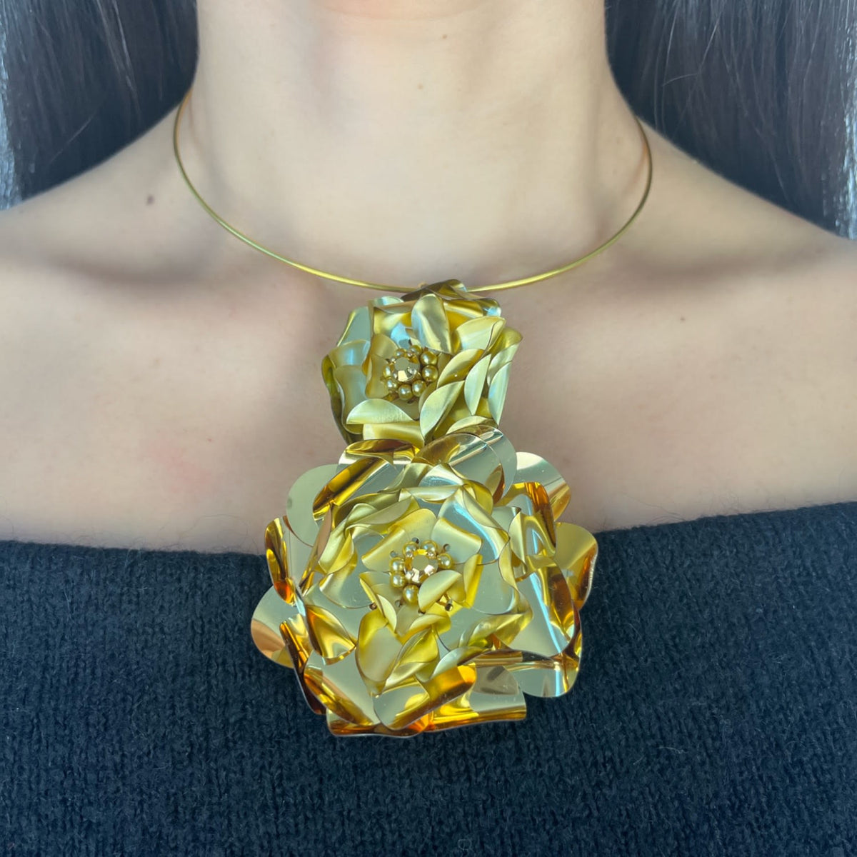 The Camellia Choker Necklace by Pinar Ozevlat is a spectacular and elegant accessory. This two-tier choker is full of character and texture, conveying the beauty of fine crochet work with hand-sculpted sequins forming Camellia blooms. It is a lightweight statement piece strung onto a gold-plated wire choker.