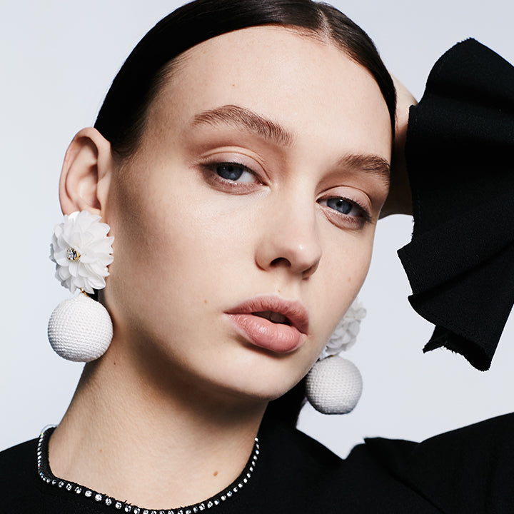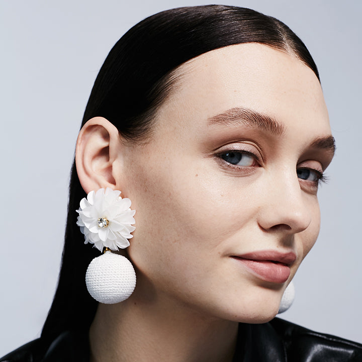 The Blossom Bon Bons White by Pinar Ozevlat are a feminine and stylish accessory. These dangle earrings feature frosted white sequins that convey the beauty of fine crochet work. Adorned with Preciosa Crystals and Swarovski Pearls, they add a statement surprise to your day-to-night glamour.