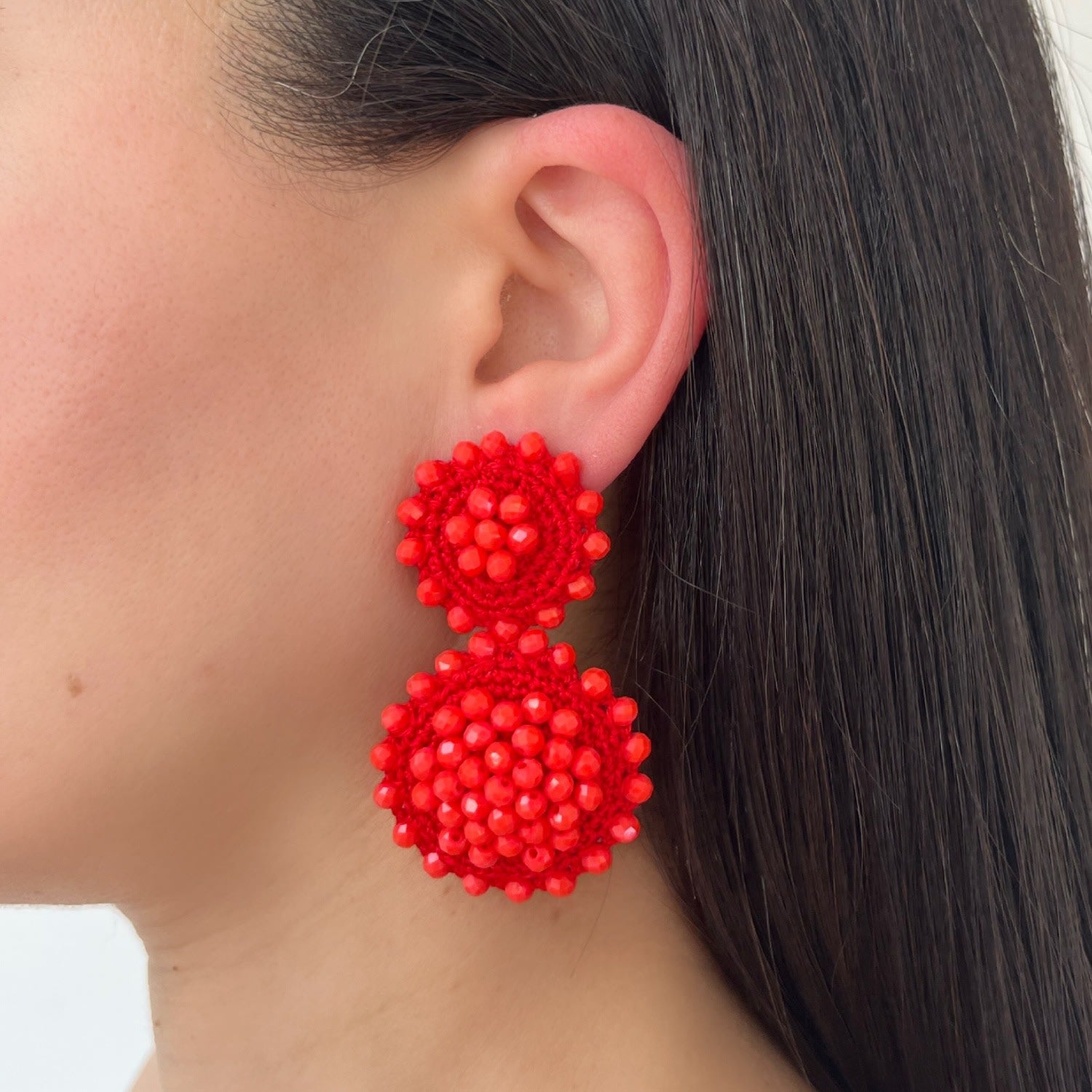 These Sunflower Drop Earrings Cherry by Pinar Ozevlat are a calm and elegant statement piece. Inspired by nature, they are handcrafted using traditional crocheting and weaving techniques with pearl cotton thread and crystal beads. Lightweight and versatile, these earrings can transition from a casual day look to an elegant night out. They are a timeless accessory that celebrates natural materials and skilled craftsmanship.