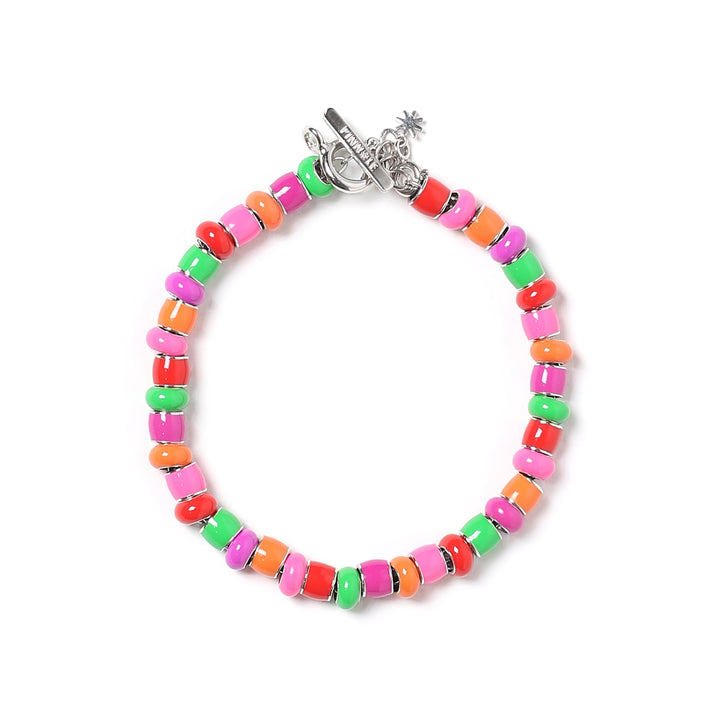 This bracelet is crafted from 925 sterling silver and features hand-mixed and hand-painted enamel. The set includes the bracelet, a needle threader, and two Playstar bead stoppers.