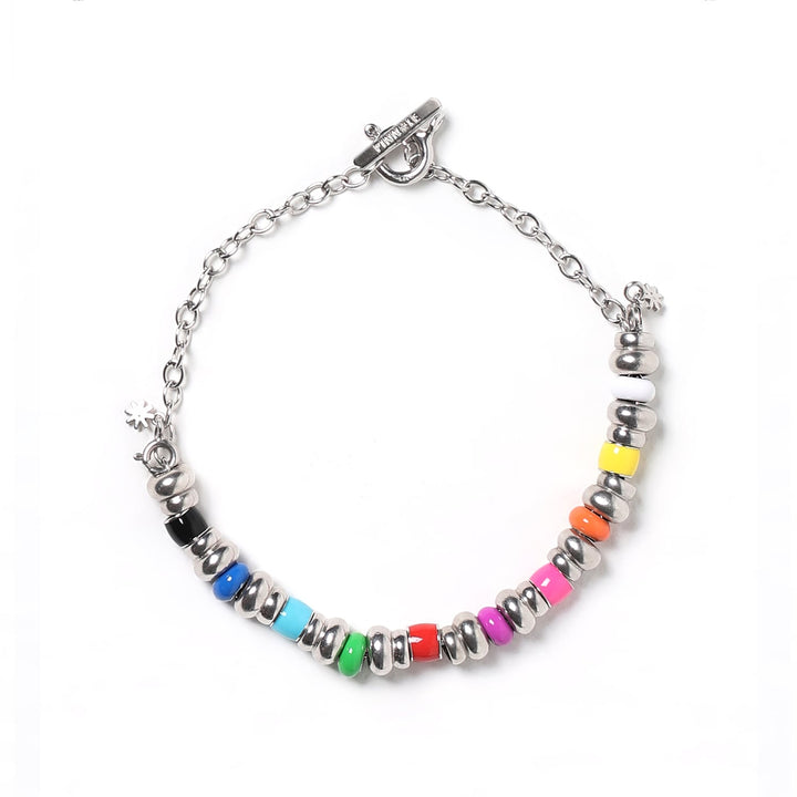 This bracelet is crafted from 925 sterling silver and features hand-mixed and hand-painted enamel. The set includes a bracelet, a needle threader, and two Playstar bead stoppers.