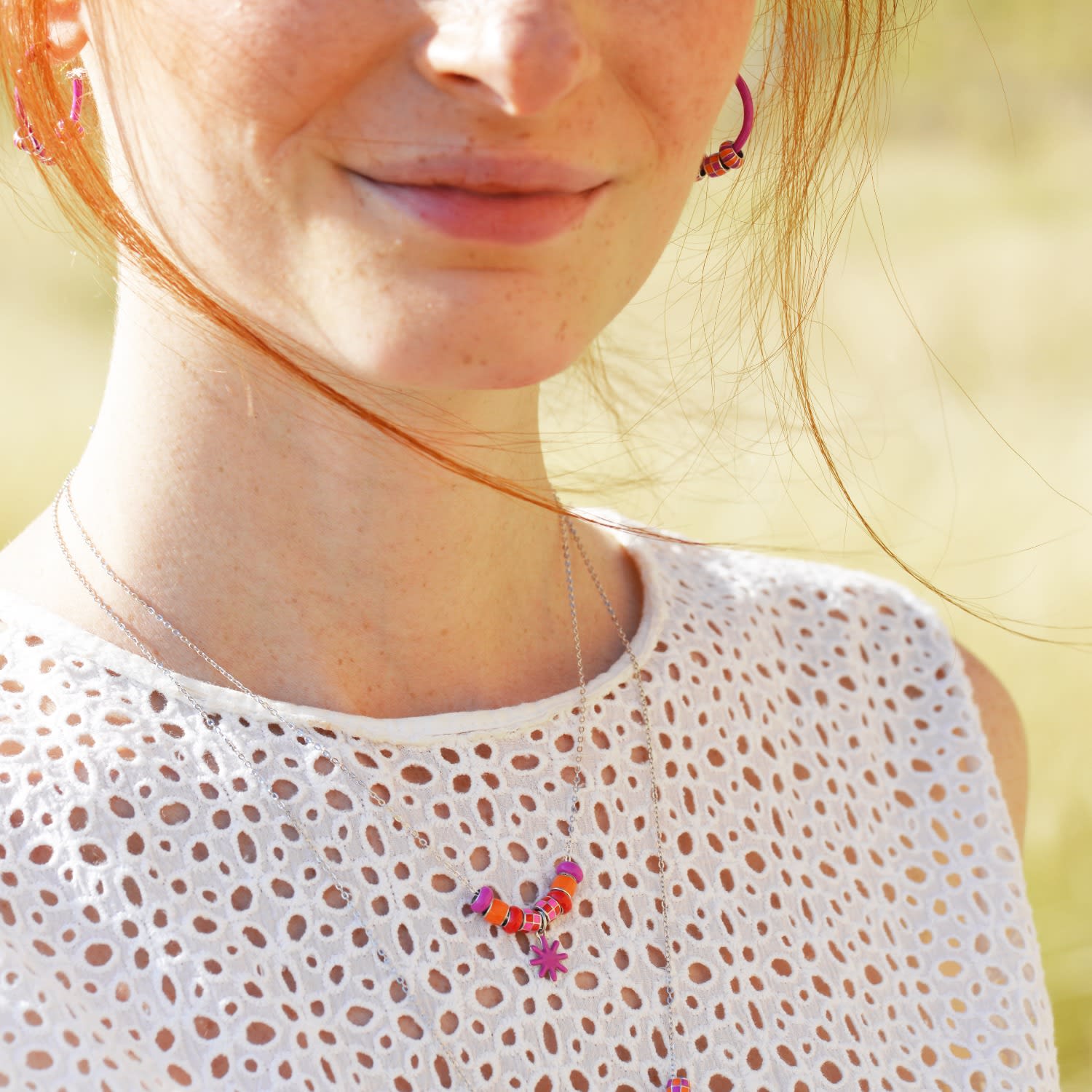 This beaded necklace is made from 925 sterling silver and hand-mixed, hand-painted enamel. It comes with a 5cm (2-inch) extender and is available in sizes S, M, and L. The piece is handcrafted.