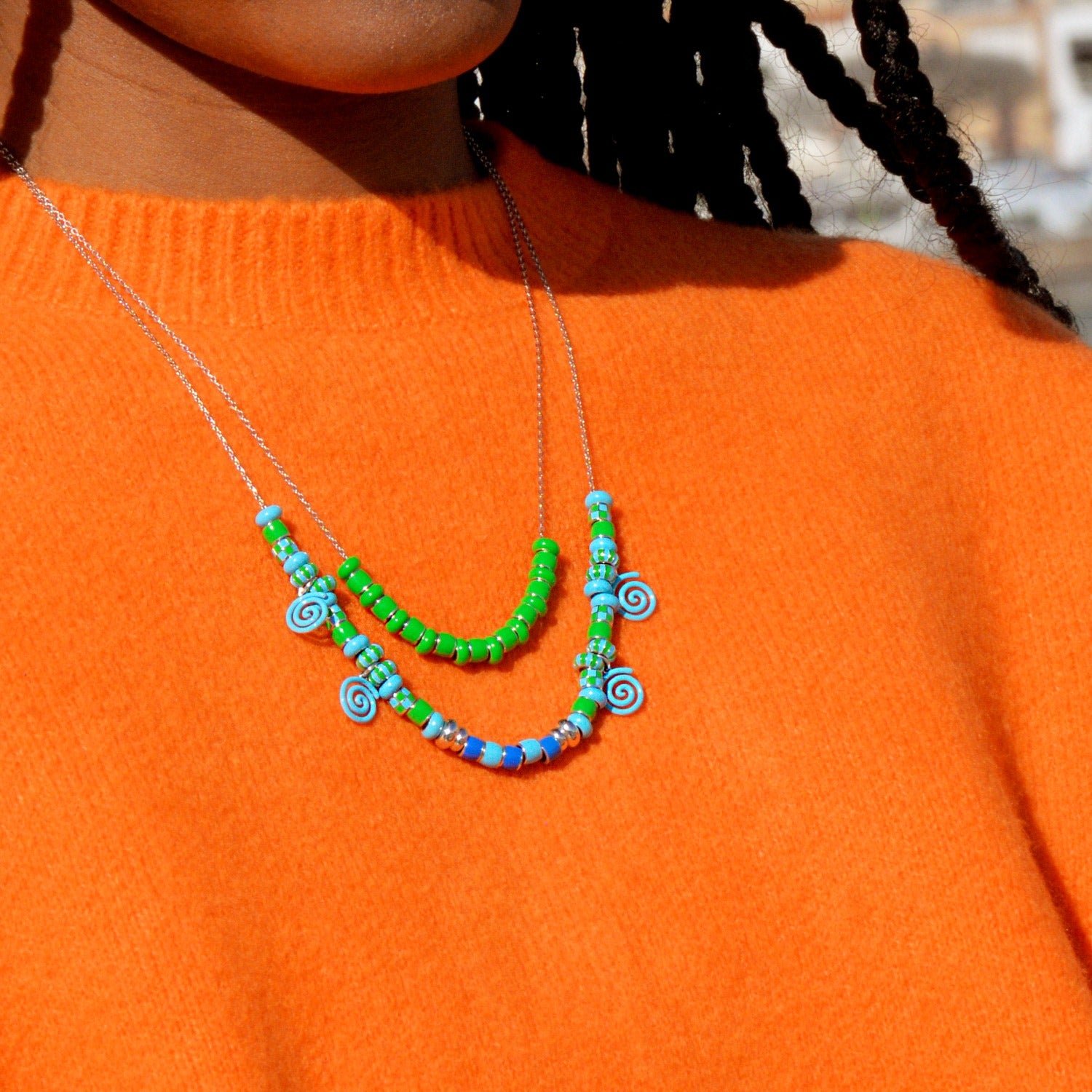 This beaded necklace is made from 925 sterling silver and hand-mixed, hand-painted enamel. It comes with a 5cm (2-inch) extender and is available in sizes S, M, and L. The piece is handcrafted.