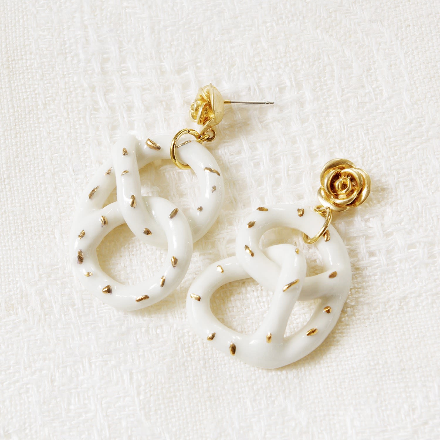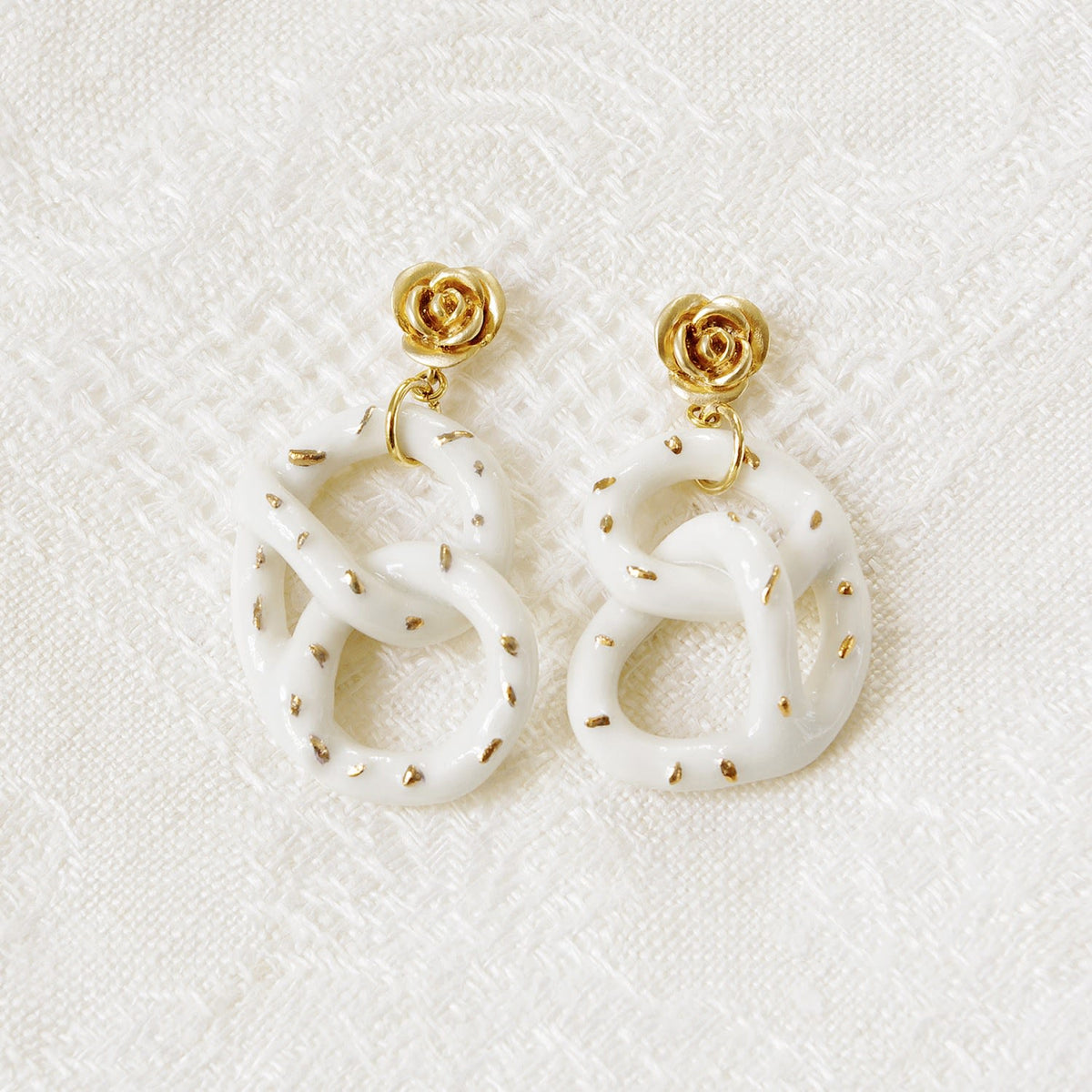 Features handcrafted porcelain pretzel charms with gold lustre salt. The earrings are made with gold-plated brass roses and 925 sterling silver earring posts.