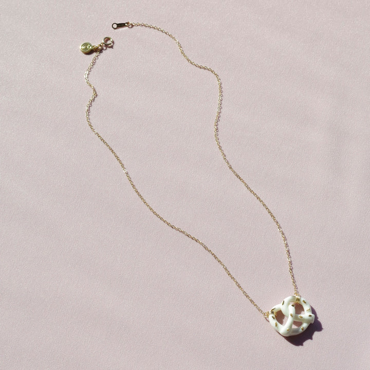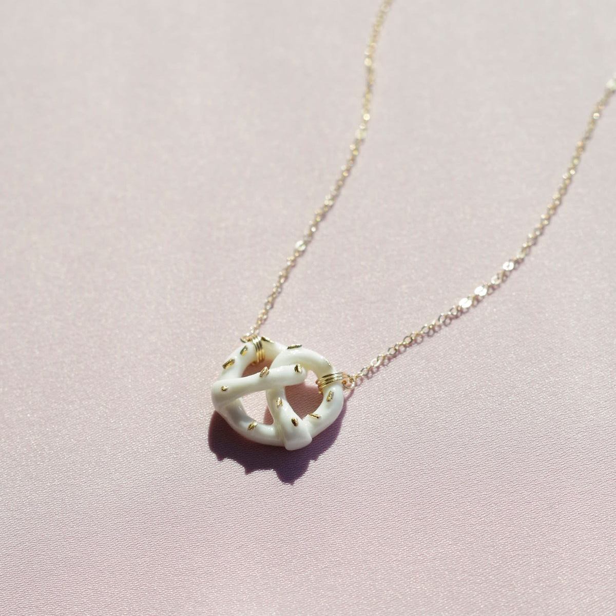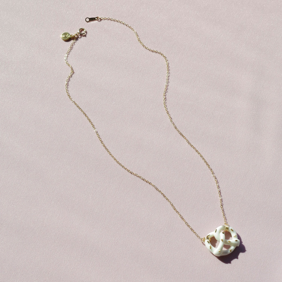 Features a handcrafted porcelain pretzel with gold lustre salt on a 14k gold-filled chain. The gold-plated metal may fade over time.