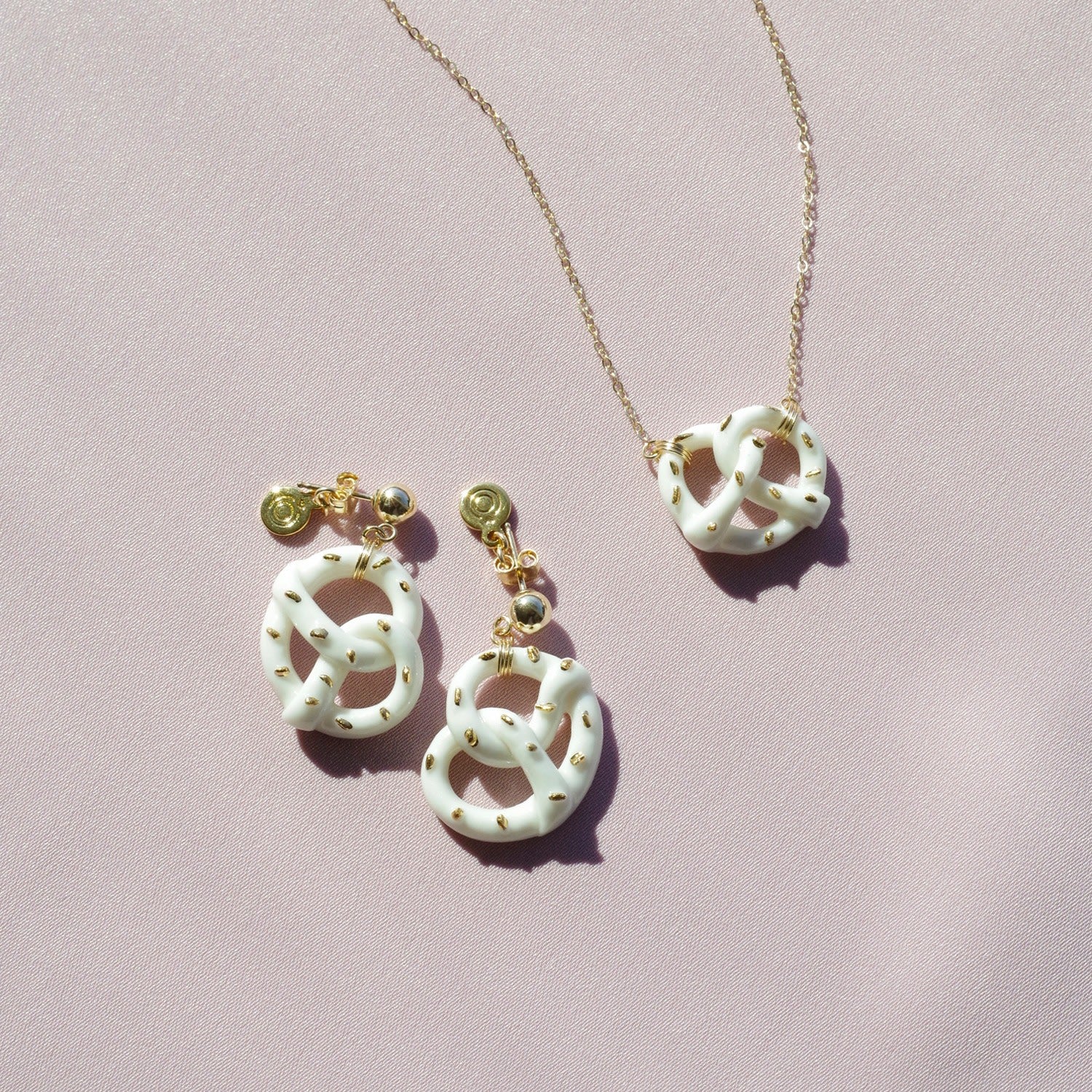 This Mini Porcelain Pretzel Necklace by Poporcelain is a delightfully unique and charming piece from the brand's exclusive bakery. Each handcrafted porcelain pretzel is a tiny work of art, with a unique shape and a delicate touch of gold lustre salt. This necklace is a playful statement that celebrates individuality and creative design. It’s an irresistible and whimsical piece that adds a touch of lighthearted fun to your look.