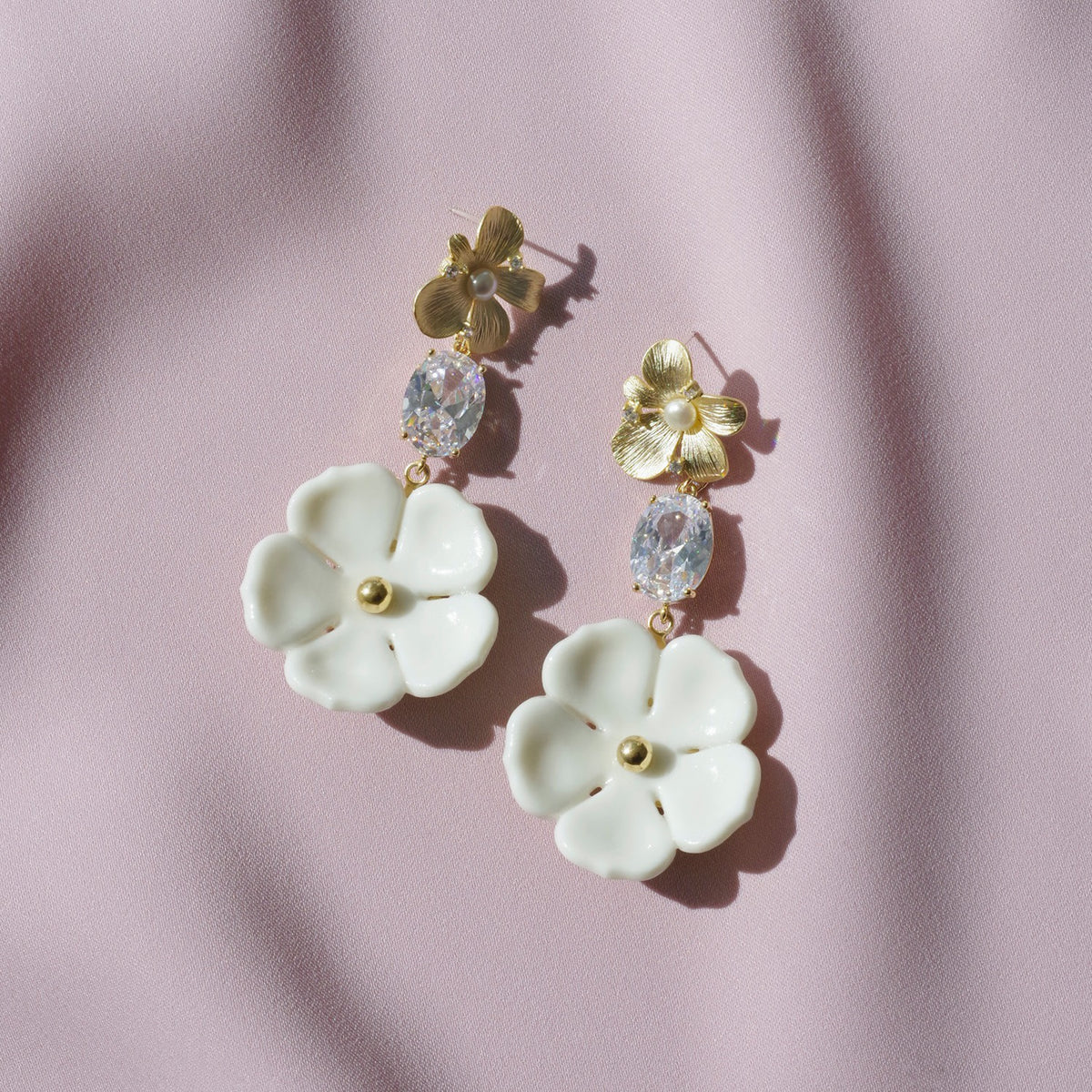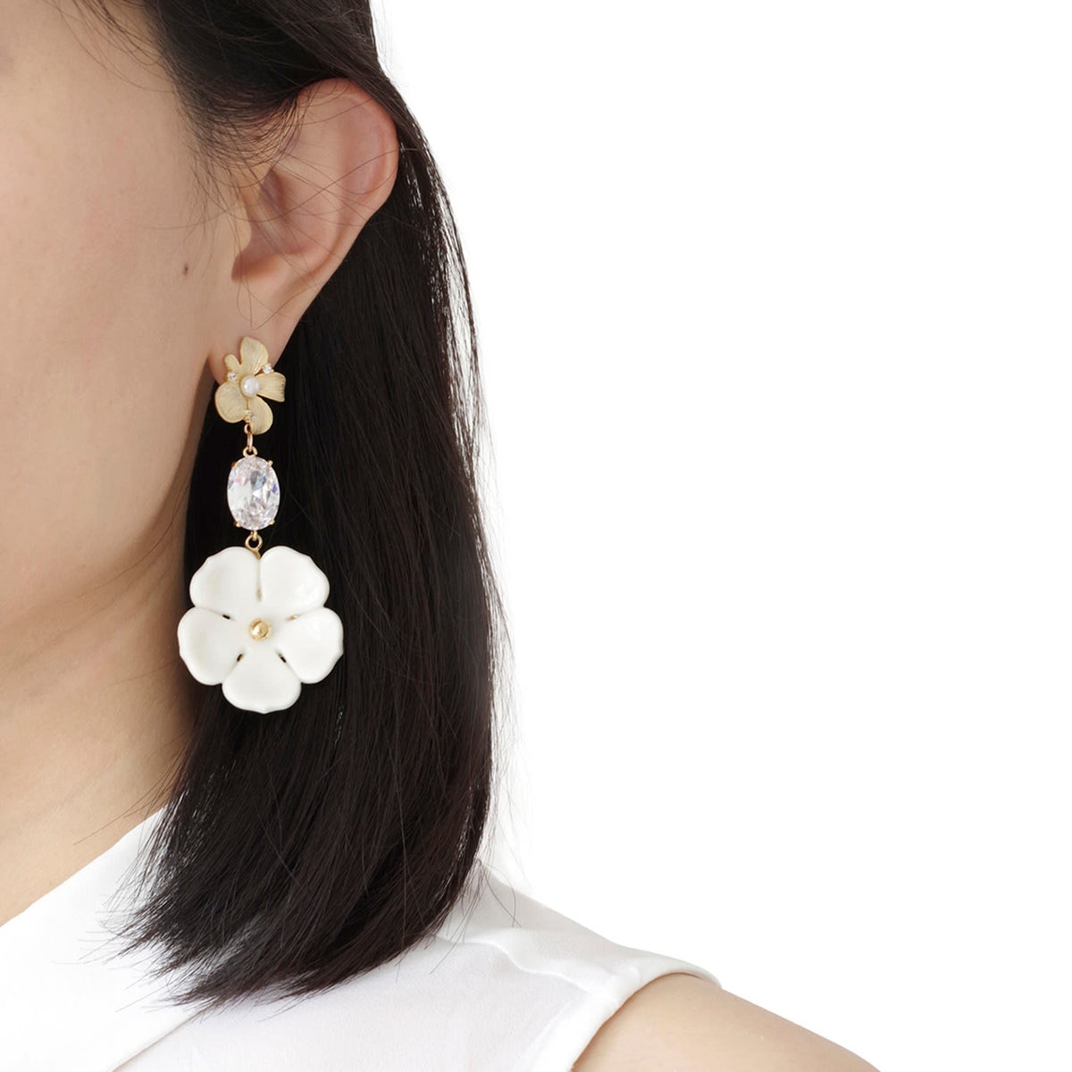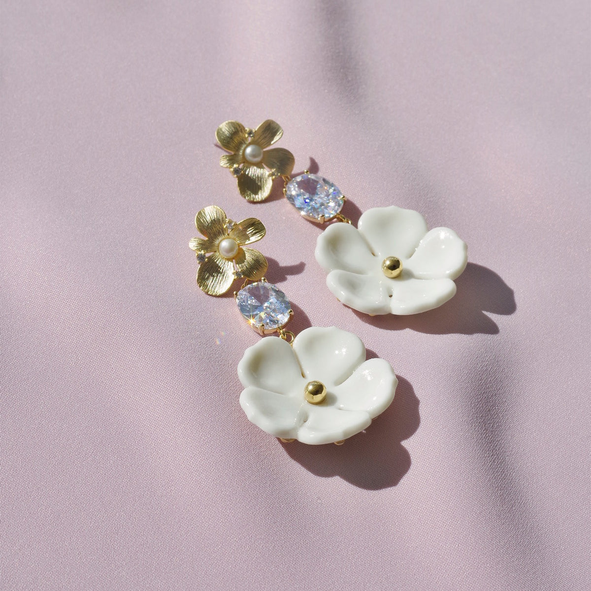 These Crystal Floral Bloom Statement Earrings by Poporcelain are a charming and irresistible combination of crystals, flowers, and pearls. The handmade white porcelain flowers give the earrings a delicate, artistic feel, while the cubic zirconia and freshwater pearls add sparkle and elegance. They are a statement of whimsical femininity, perfect for adding a touch of floral charm and light to any outfit. Each piece is unique, reflecting the artisanal care with which it was made.