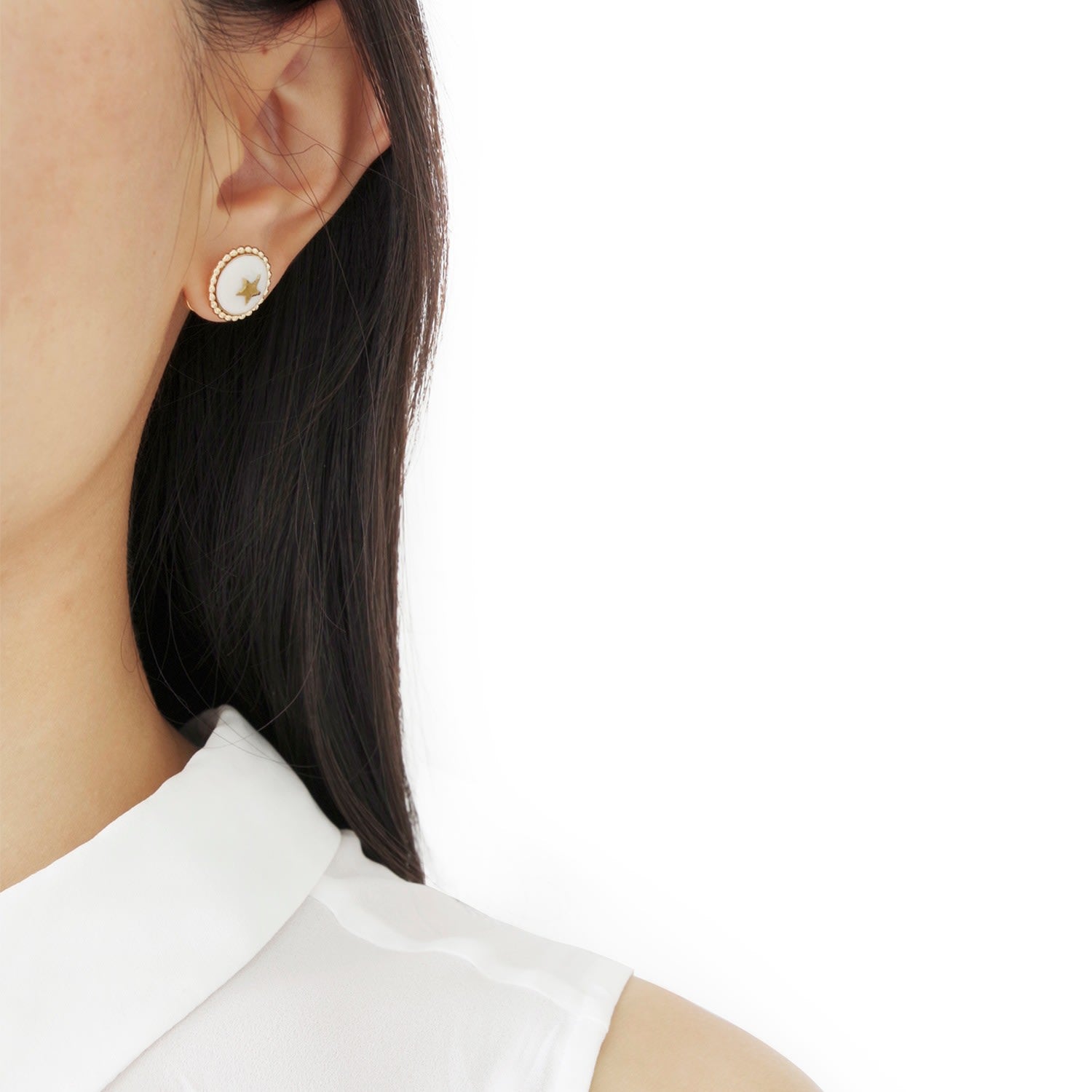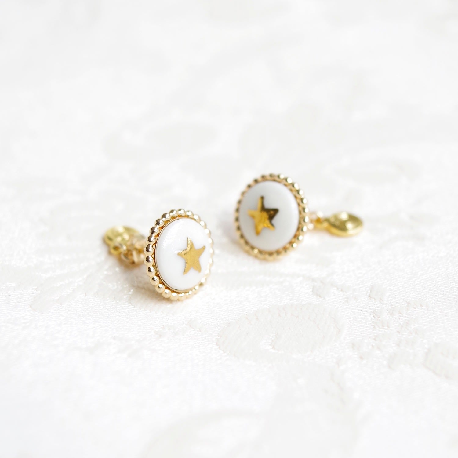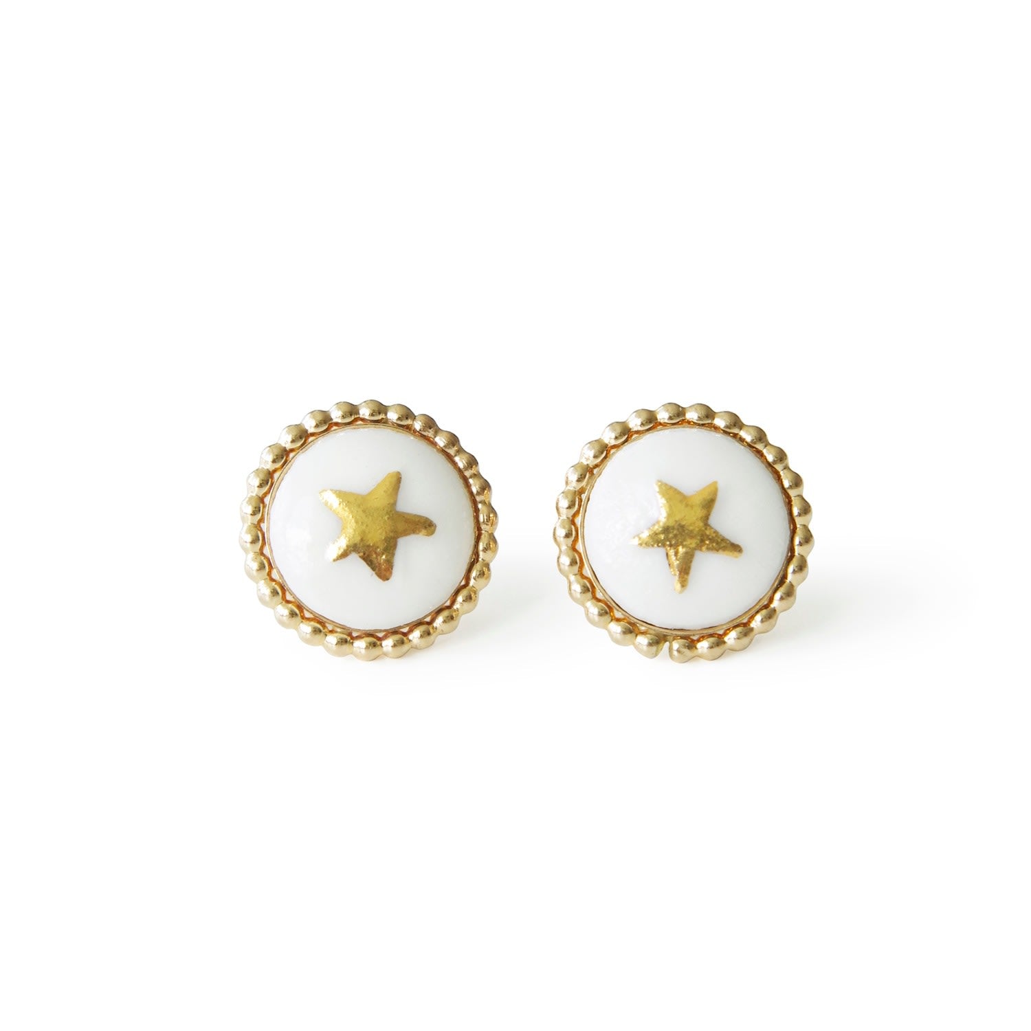 The Gold Lustre Star Stud Earrings by Poporcelain are a simple and whimsical accessory. These studs feature a handmade porcelain cabochon with a hand-painted gold lustre star. The star symbolizes holding on to your dreams, making these a perfect accessory for everyday wear. They are made with gold-filled bases, posts, and backs.