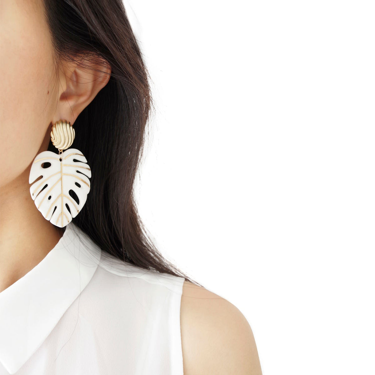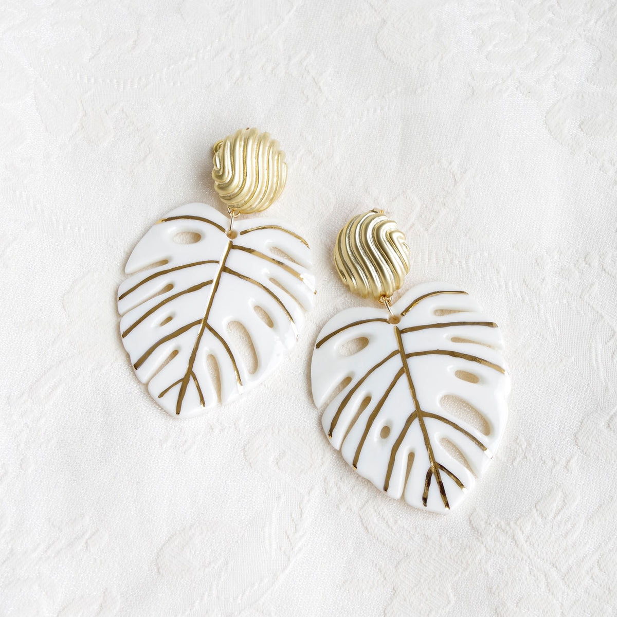 These Golden Monstera Leaf Statement Earrings by Poporcelain are a delightful and unique accessory. They are designed for when you want to make a statement, with their monstera leaf shape and hand-painted gold luster on white porcelain. The earrings are a beautiful blend of natural inspiration and artistic craftsmanship, adding a touch of bold, tropical elegance to your look.