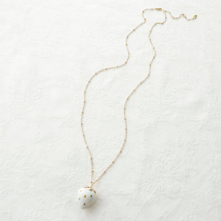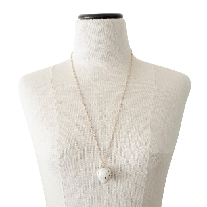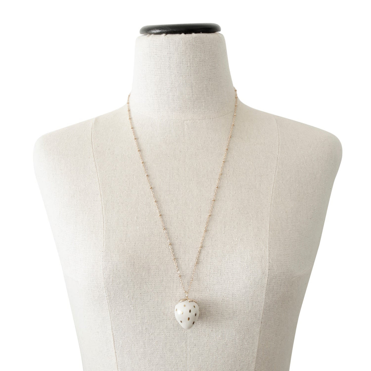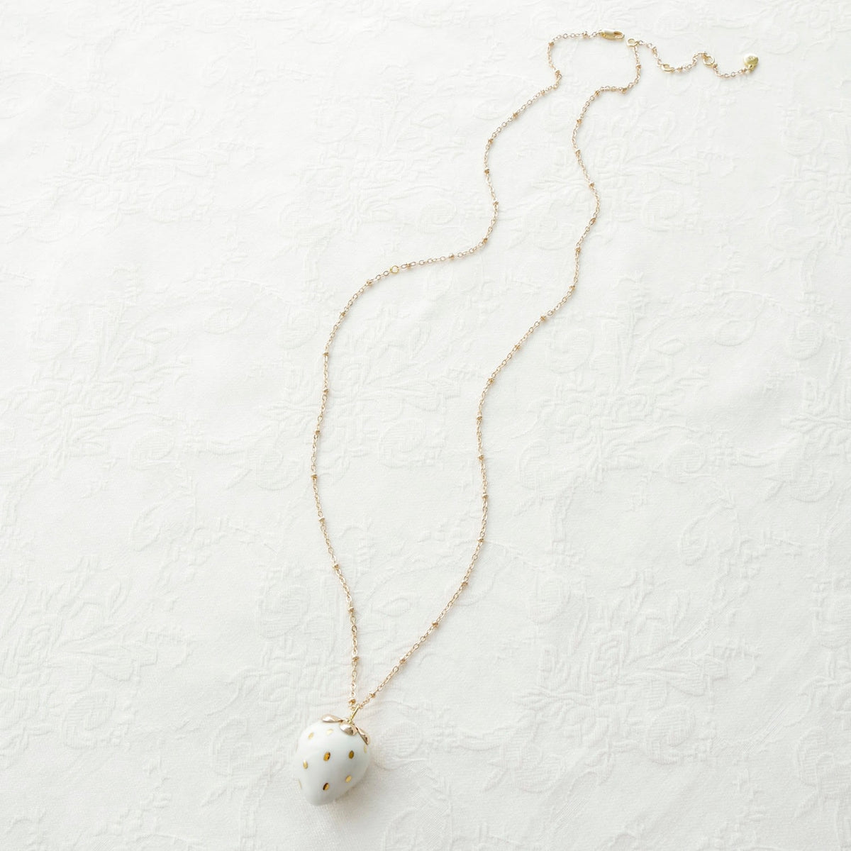 The Golden White Porcelain Strawberry Necklace by Poporcelain is a whimsical and charming accessory. The necklace features a handmade porcelain strawberry with a gold luster finish. It's a playful and unique piece that is perfect for adding a fruity touch to your holiday outfit.