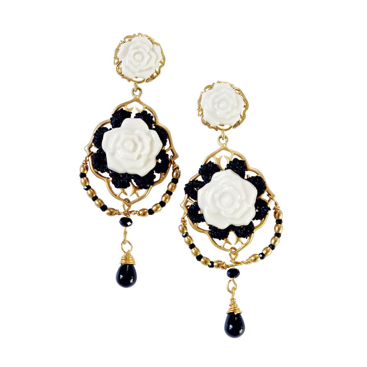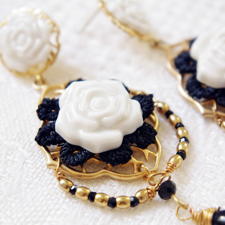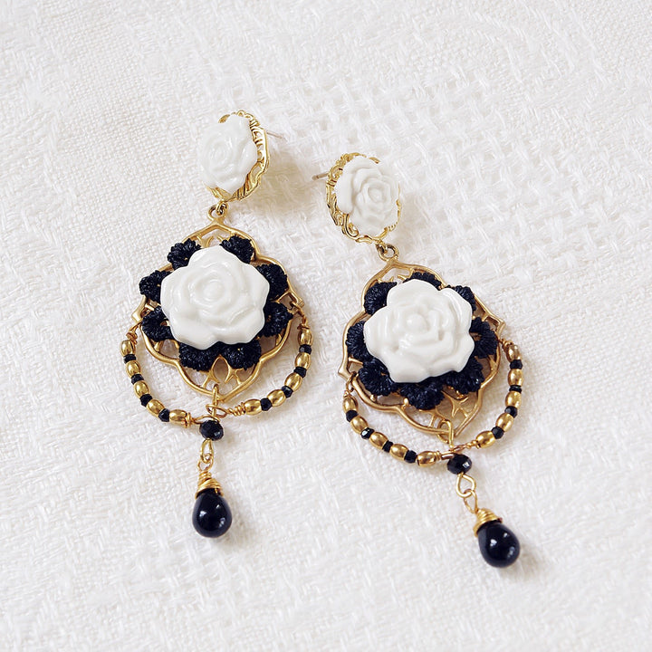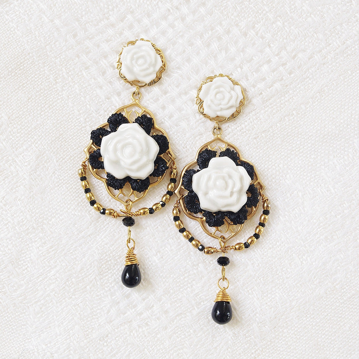 These earrings are handmade with porcelain, gold-plated brass, 925 sterling silver posts, black lace floral fabric, jet black Swarovski stones, and Czech glass teardrop stones.