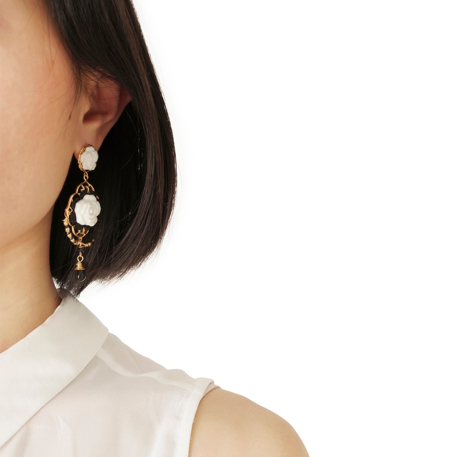These Classic Baroque Porcelain Rose Statement Earrings by Poporcelain evoke an air of classic elegance with their timeless black and gold tones. The daring combination of materials, including handmade porcelain roses and jet black Swarovski stones, gives these earrings a fresh, modern feel. They are a true statement piece, symbolizing a unique blend of craftsmanship and contemporary design.