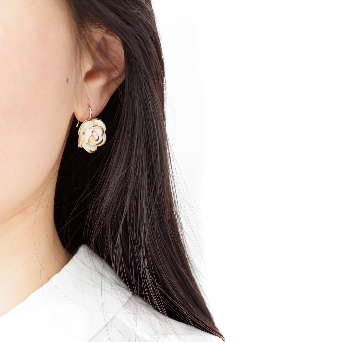 These Golden White Cloud Rose Hook Earrings by Poporcelain are a delicate and beautifully handcrafted tribute to the English garden. The miniature porcelain roses are hand-painted with a stunning gold luster and have undergone over 20 hours of kiln firing. Their unique, feminine design adds a touch of pure charm and timeless elegance to any look.