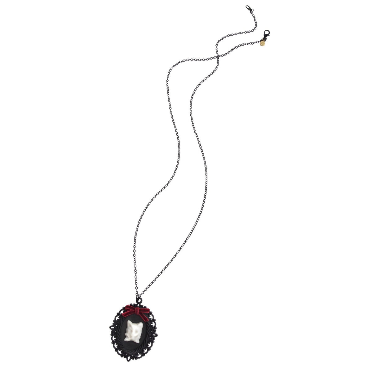 This necklace is handmade in Denmark. It features a handcrafted porcelain cat cameo with black paint coating and a burgundy velvet ribbon bow. The base and chains are black-toned.