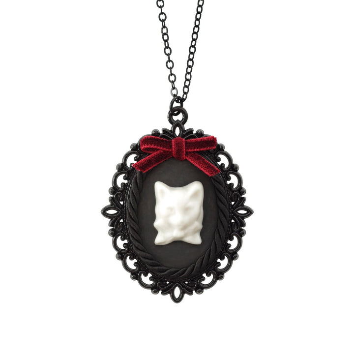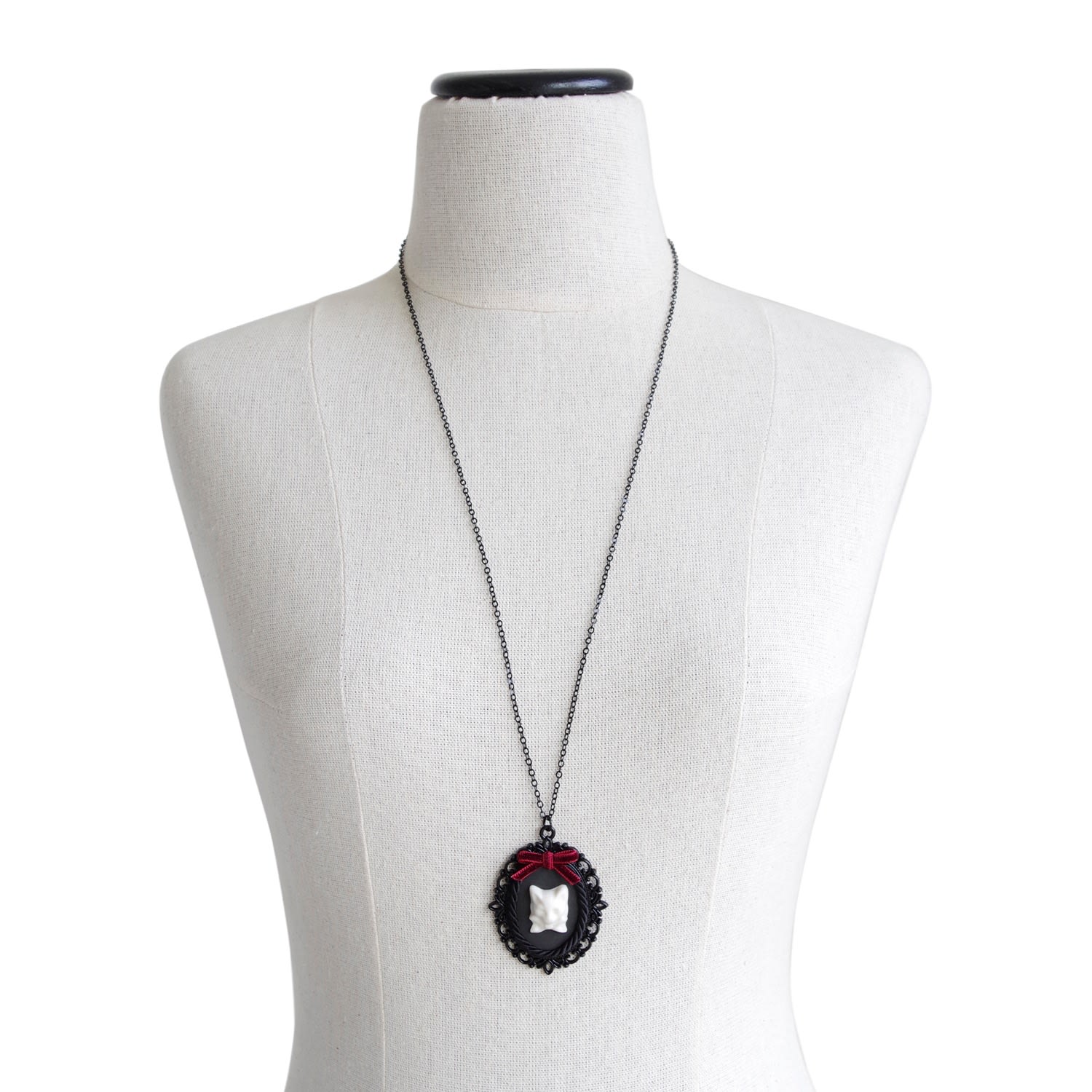 This Dark Romance Porcelain Cat Cameo Necklace by Poporcelain is not just a fashion accessory, but a true art piece. The cameo is meticulously handcrafted and hand-painted from white porcelain and features a dark romantic look with a black-toned finish. A highlighted burgundy red velvet ribbon bow adds a unique touch of Gothic elegance, making this a captivating and unique piece.