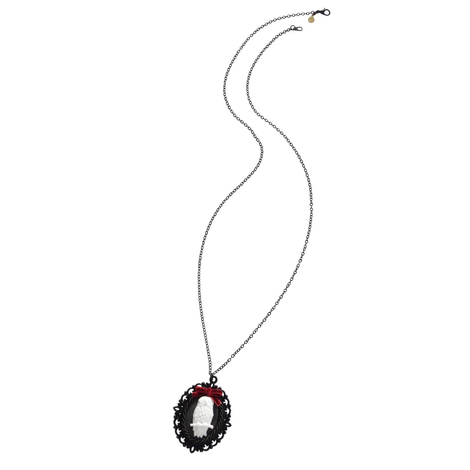 This Dark Romance Porcelain Owl Cameo Necklace by Poporcelain is a unique art piece. The porcelain cameo is carefully handcrafted and hand-painted, featuring an owl motif. With a black-tone finish and a highlighted burgundy red velvet ribbon bow, the necklace offers a dramatic and romantic aesthetic that makes a striking statement.