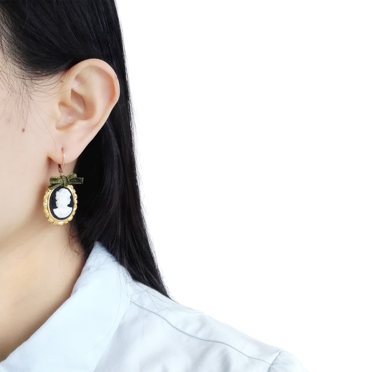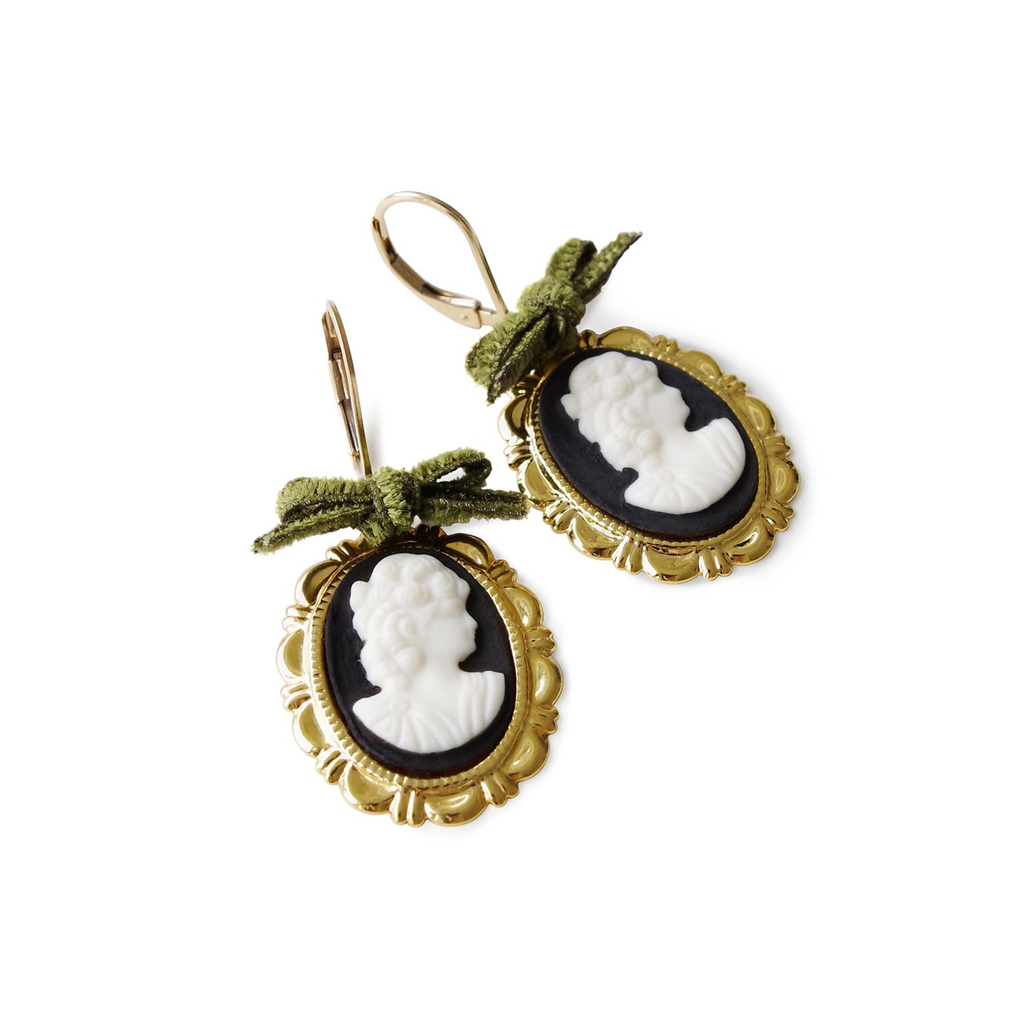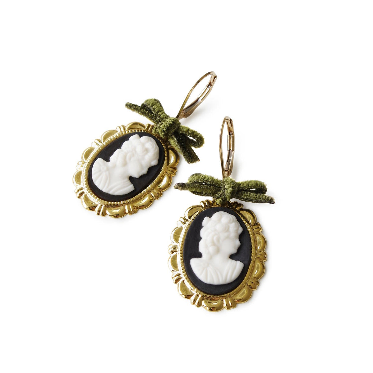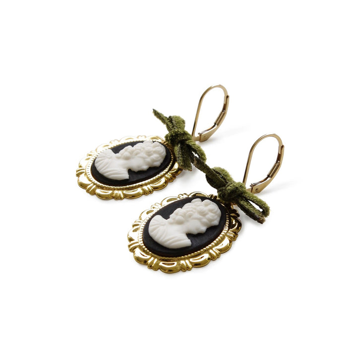 These earrings are made from handmade porcelain cameos, 14K gold-filled leverback ear hooks, and gold-plated brass trays with a velvet ribbon.