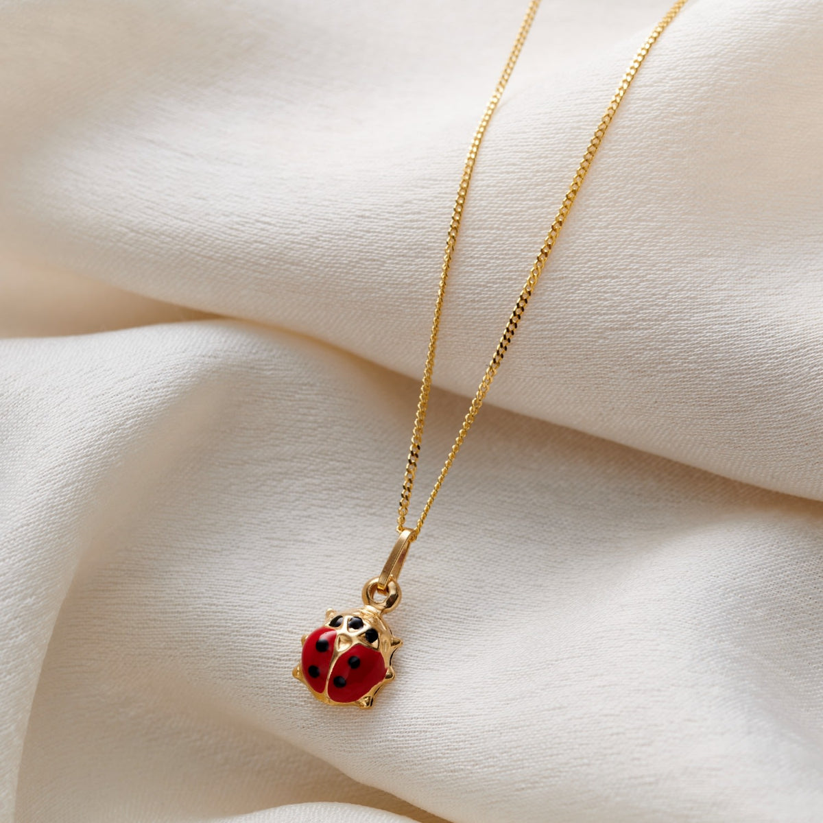 This necklace features a 9ct yellow gold ladybird charm with red and black enamel inlay. The charm is suspended from an 18-inch gold chain.
