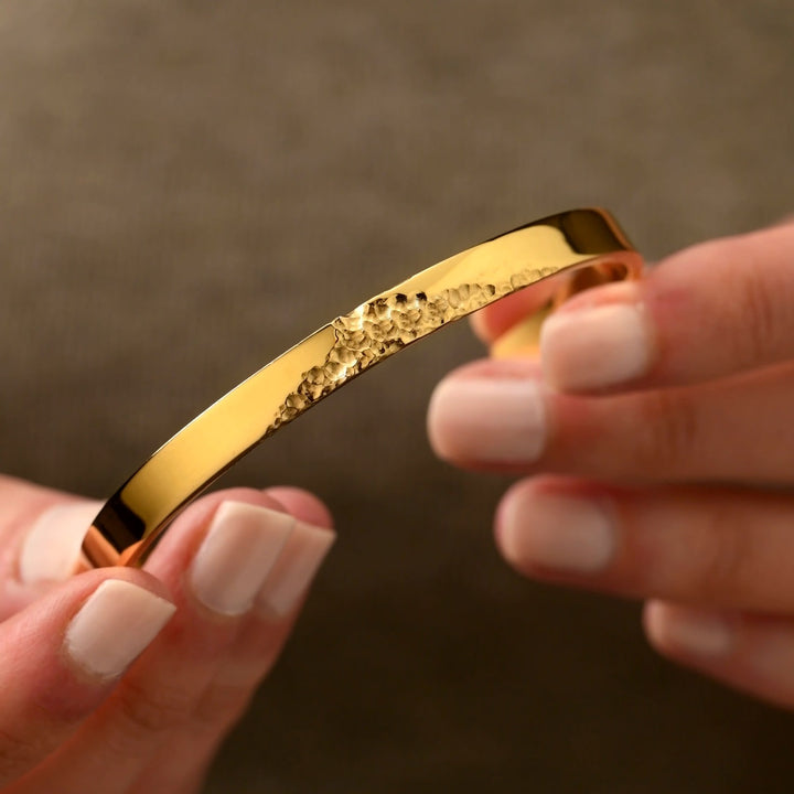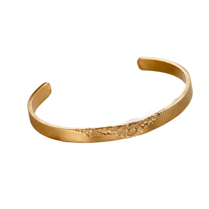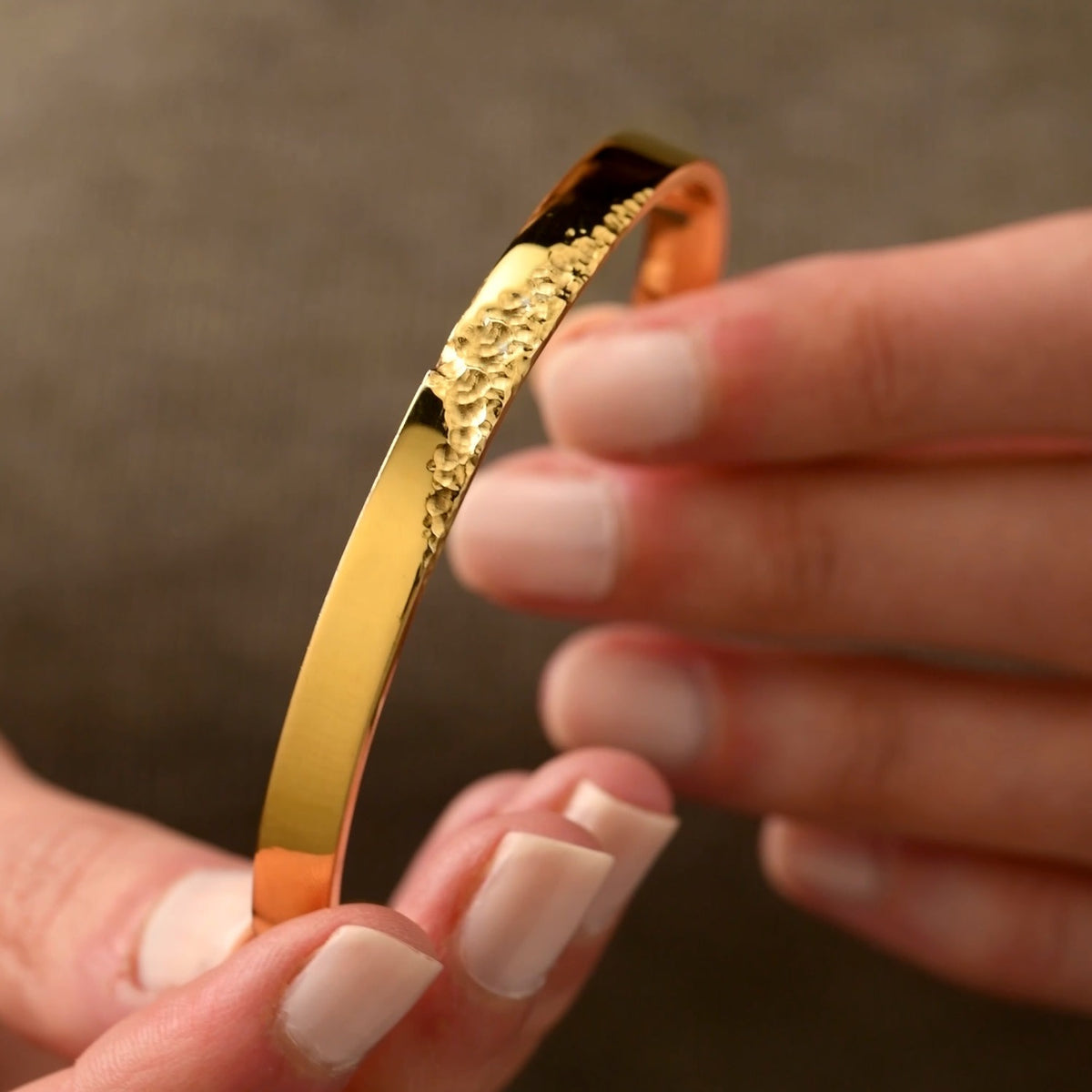 This cuff bracelet is crafted from 18ct yellow gold plated Sterling Silver. The cuff is approximately 2mm thick and 6mm wide. The cuff size is 16cm-17cm. Each piece is handmade.