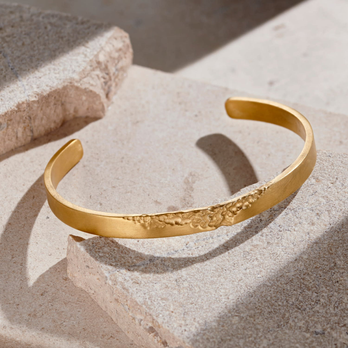 The Yellow Gold Strata Cuff by Posh Totty Designs is a beautiful and unique accessory. This cuff is handcrafted in Brighton from 18ct yellow gold plated Sterling Silver. The design is inspired by the earth's crust and natural erosion, making each piece truly unique.