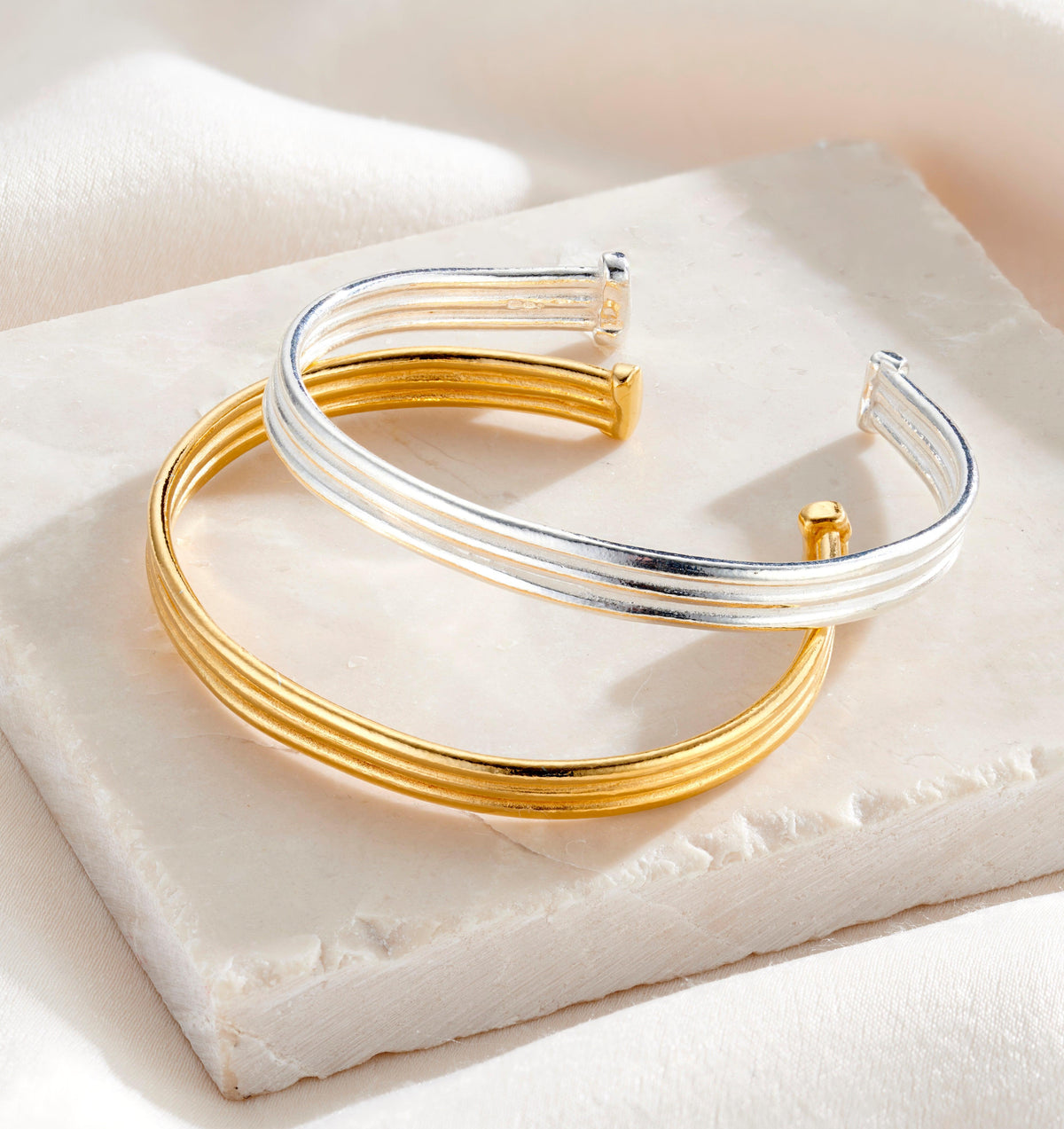 The Column Open Cuff Bangle by Posh Totty Designs is a gorgeous statement piece. This bangle, which is part of the Column Collection, is designed in their Brighton workshop. It's the perfect statement piece when worn on its own or a beautiful addition for those who like to stack. It is crafted from high-quality recycled sterling silver and gold.