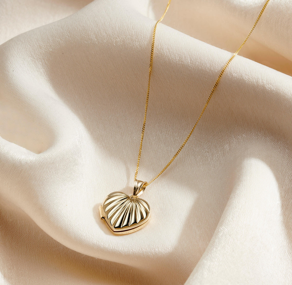This locket is individually handmade to order in the UK. It is crafted from 9ct gold and features an intricate shell design.