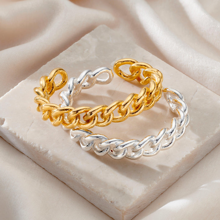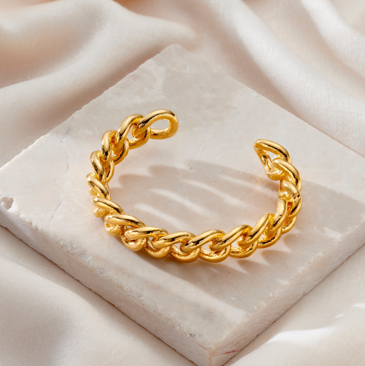 This cuff bracelet is made of sterling silver. It features a chunky curb link design and is also available with 18ct gold plating.
