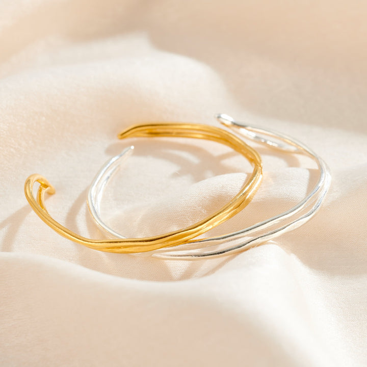 This cuff is crafted from Sterling Silver and plated with a thick layer (approx. 1 micron) of 18-karat yellow gold.
