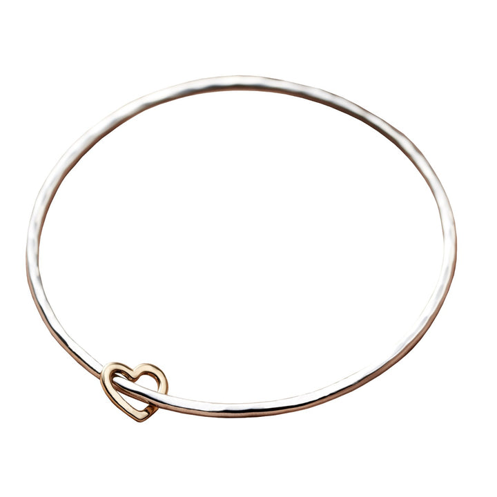 The Gold Heart Sterling Silver Bangle by Posh Totty Designs is a stunning and personal piece. This bangle is handcrafted from fine sterling silver with a beautiful, lightly hammered finish. A solid 9ct gold heart charm moves freely on the bangle, catching the light beautifully. This bangle is a perfect gift for special occasions like a wedding, a new baby, or an anniversary.