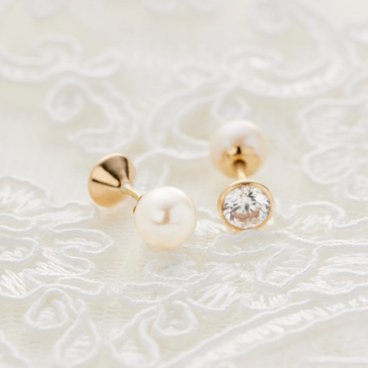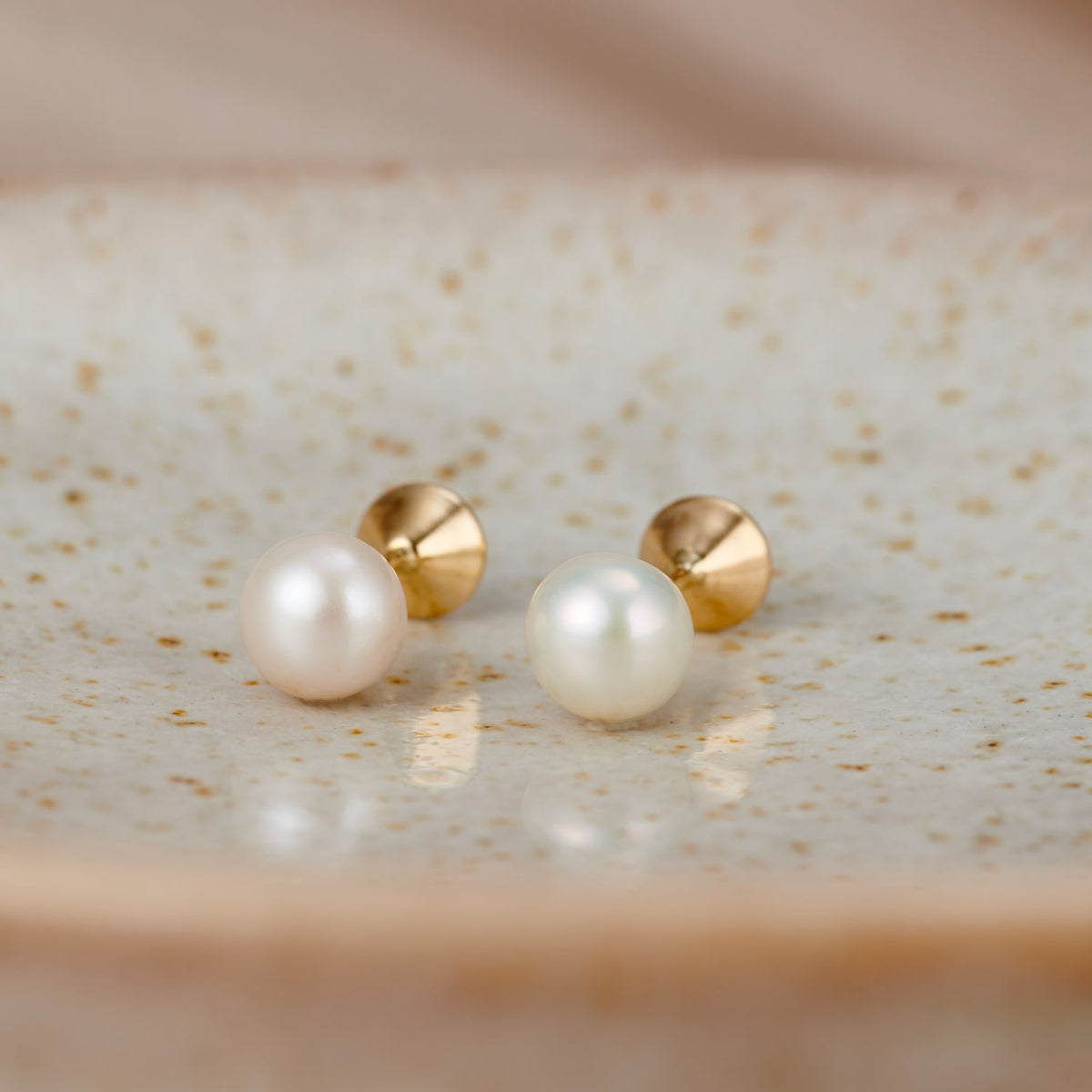 These stud earrings are handmade from solid 9ct gold and freshwater pearls. They feature a cubic zirconia stone detail. Each pearl measures approximately 6mm in diameter, and screw-on stud backs are included.