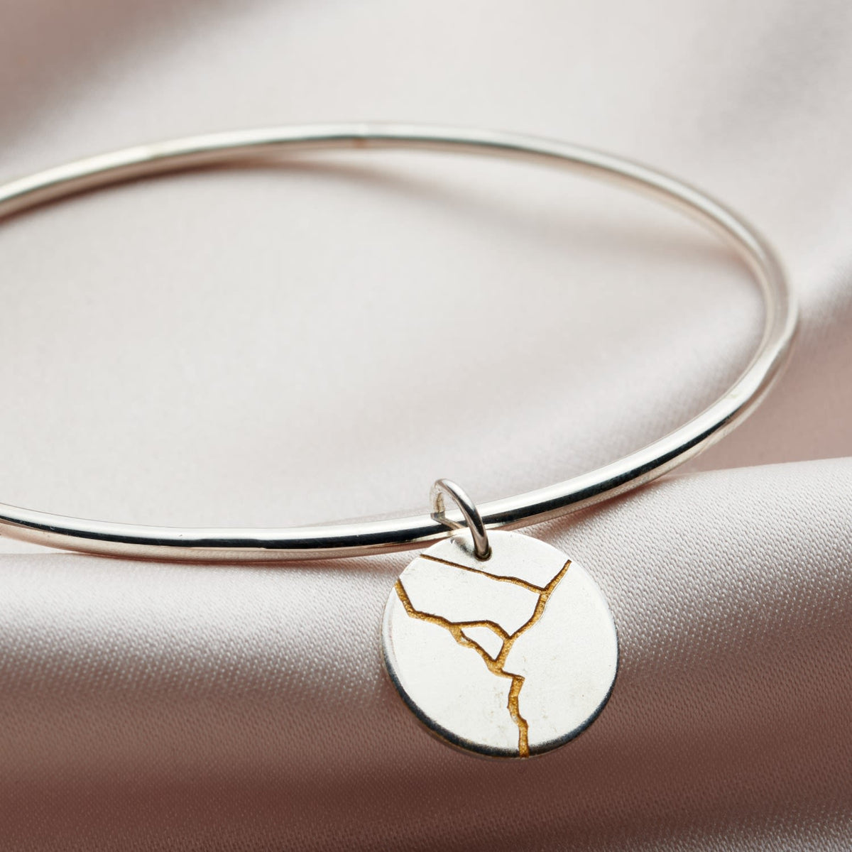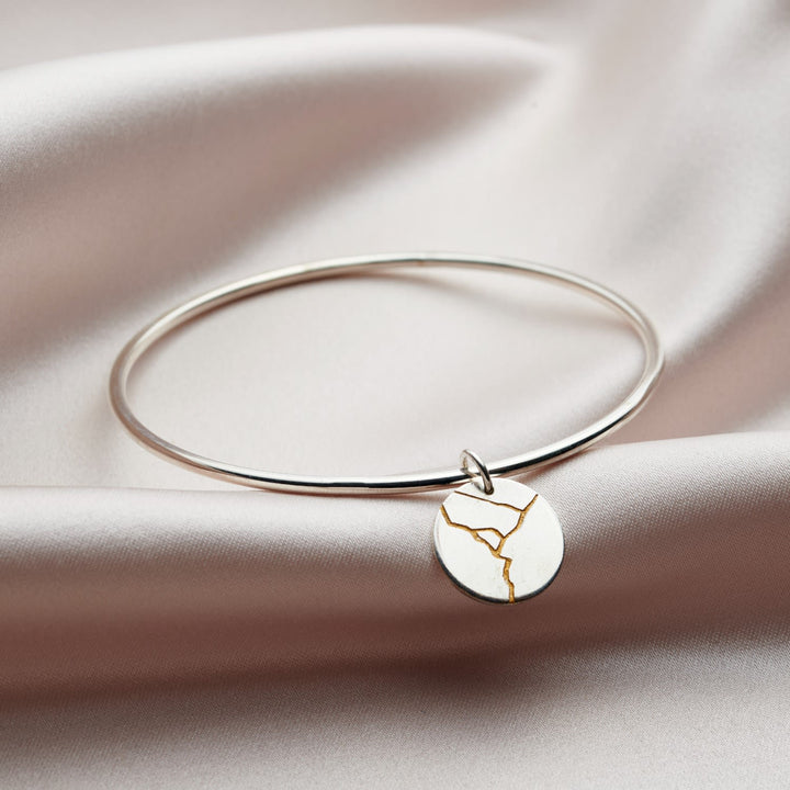 This personalized bangle is handmade from 925 sterling silver. The disc charm features an engraved, Kintsugi-inspired design highlighted with gold fill.