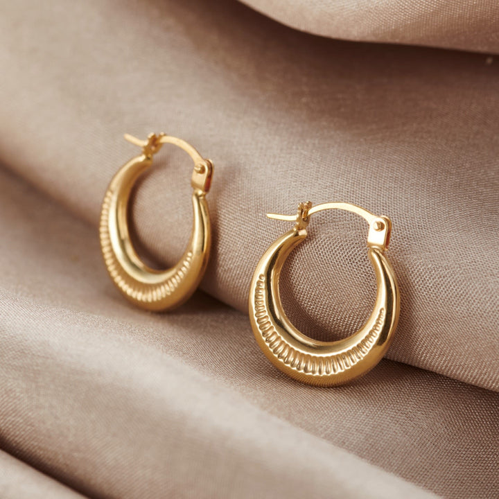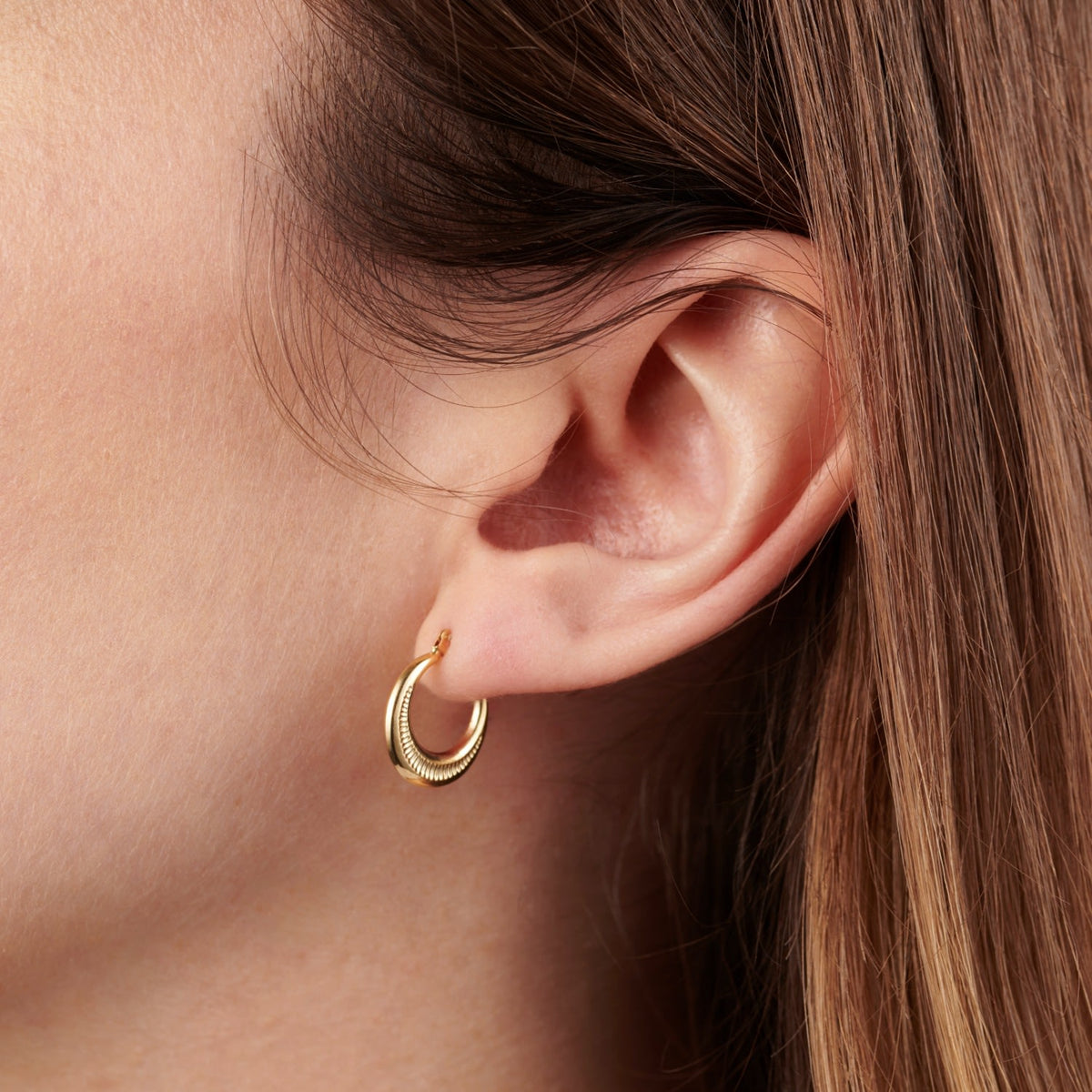 These Crescent Moon Creole Gold Hoop Earrings by Posh Totty Designs are a beautiful, celestial-inspired accessory. Made from solid 9ct yellow gold, each earring features a moon shape design with a minimal ridged pattern. The classic Creole fastening makes them a perfect gift for a loved one or a treat for yourself.