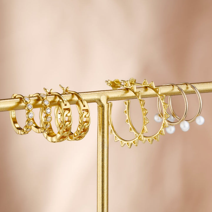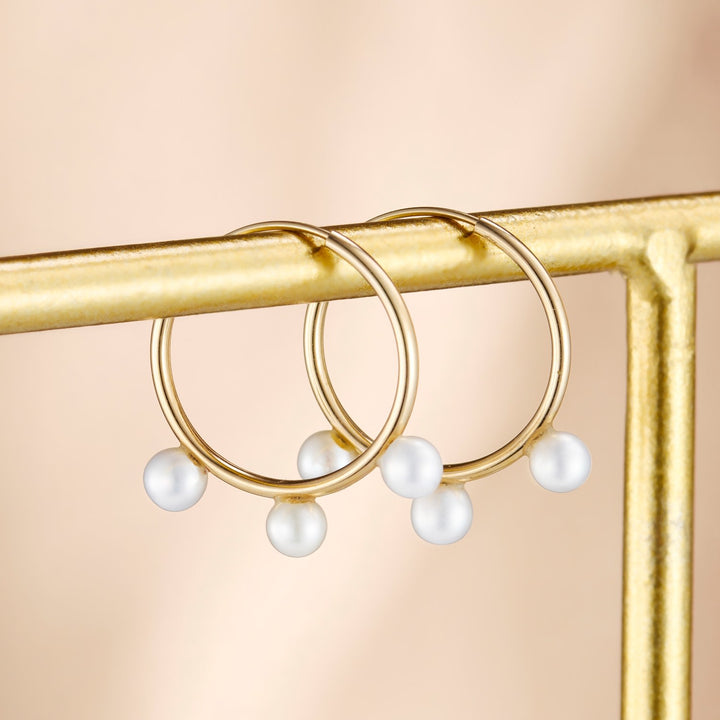 These hoops are made from 9ct yellow gold and feature freshwater pearls. The hoops measure 1.4 cm, and the pearls are 0.2 cm.