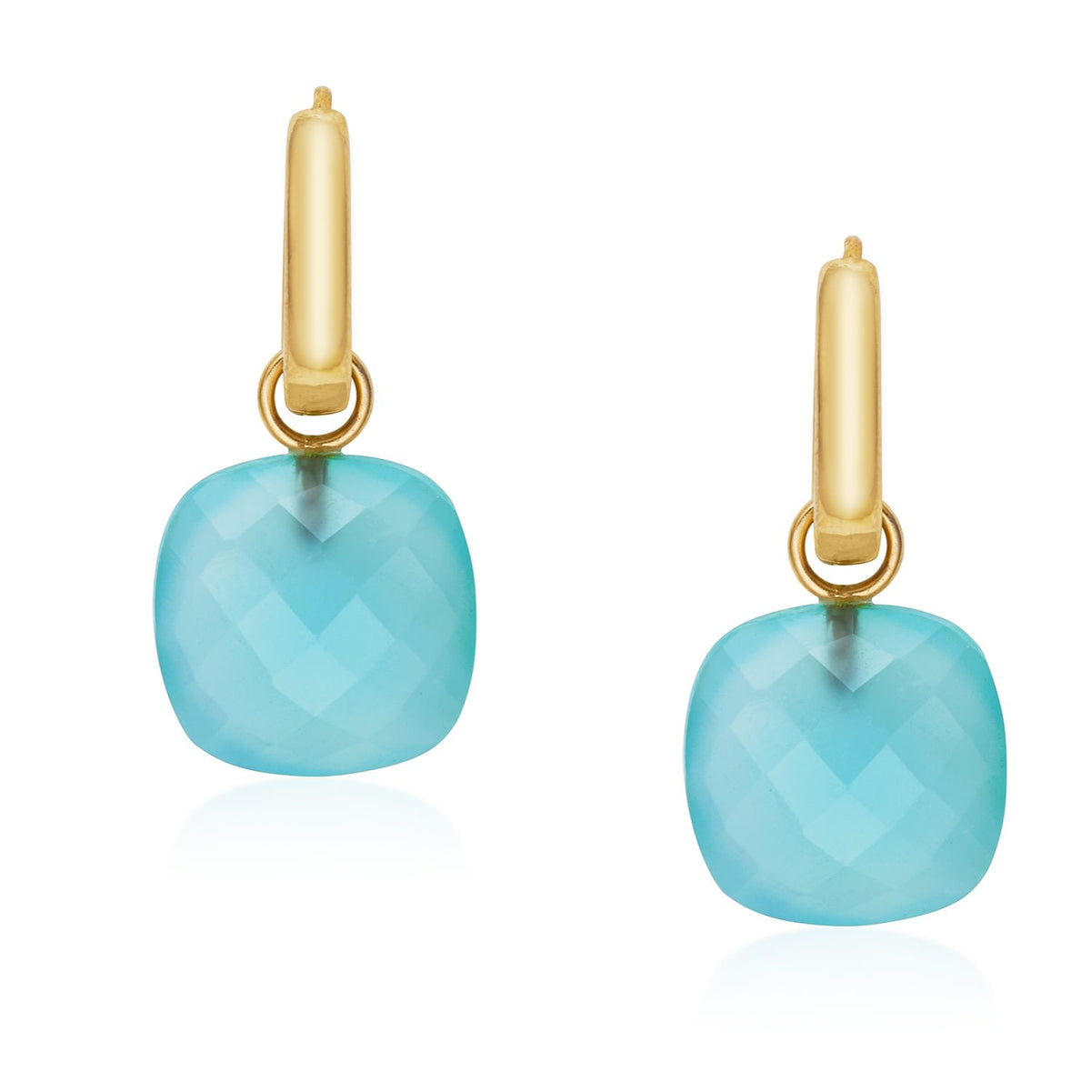 These hoops are handcrafted from 14-karat gold and measure 0.5 inches in diameter. They feature natural, cushion-cut blue chalcedony drops.