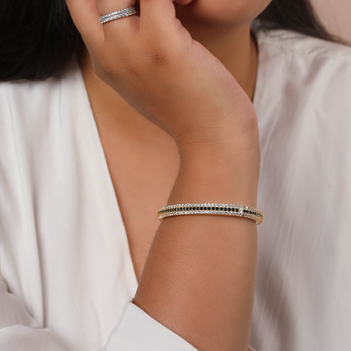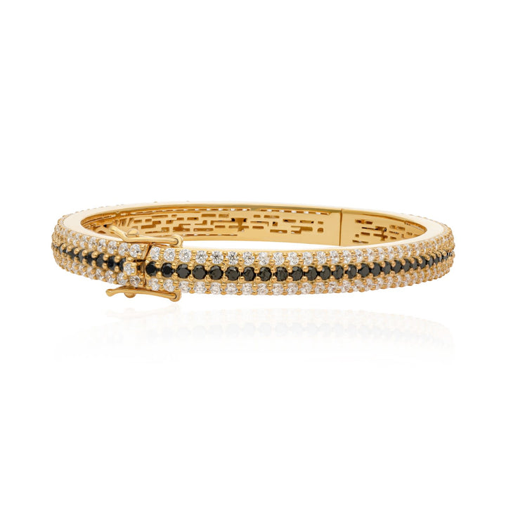 This bracelet is expertly handcrafted in 14k gold plated sterling silver with 2-micron plating. It is hand-set with shimmering stones and glossy black spinel stones and features a box clasp.