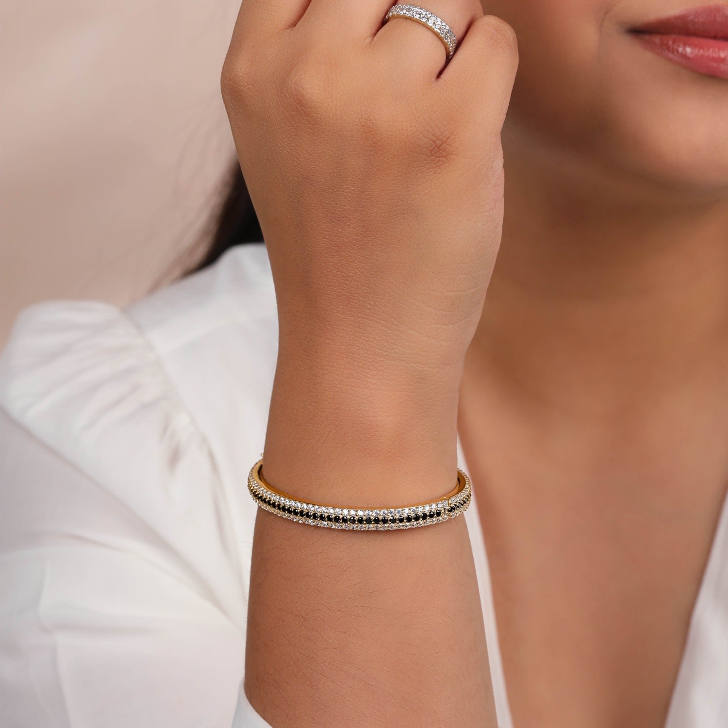 The Summer Sparkle Bracelet by Preeti Sandhu is a dazzling and alluring accessory. Hand-set with shimmering stones and a row of glossy black spinel stones, it adds a touch of tasteful minimalist glamour. Its expertly handcrafted design and seamless box clasp make it an elegant and effortless piece to wear alone or stacked with other bangles.