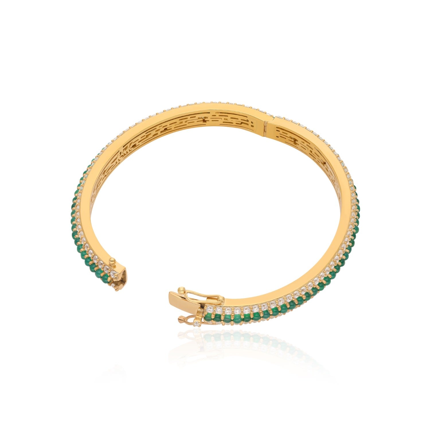 This bangle bracelet is handcrafted from 14k gold-plated sterling silver (2 microns thick). It is set with Green Onyx stones.