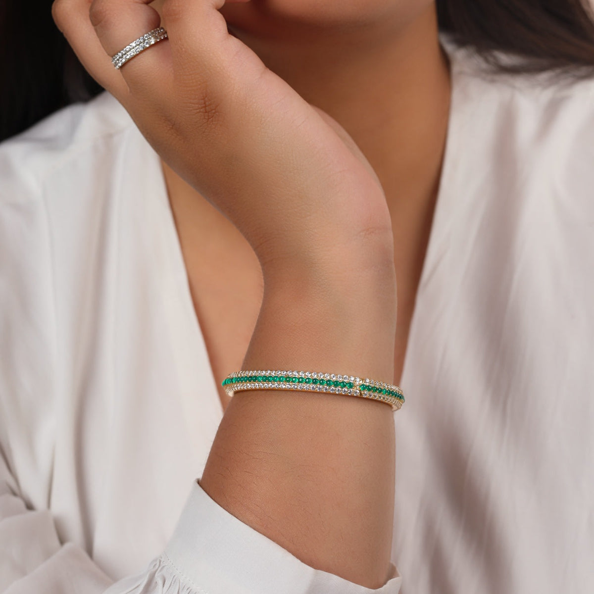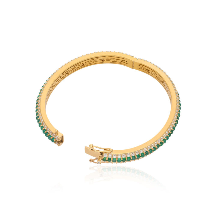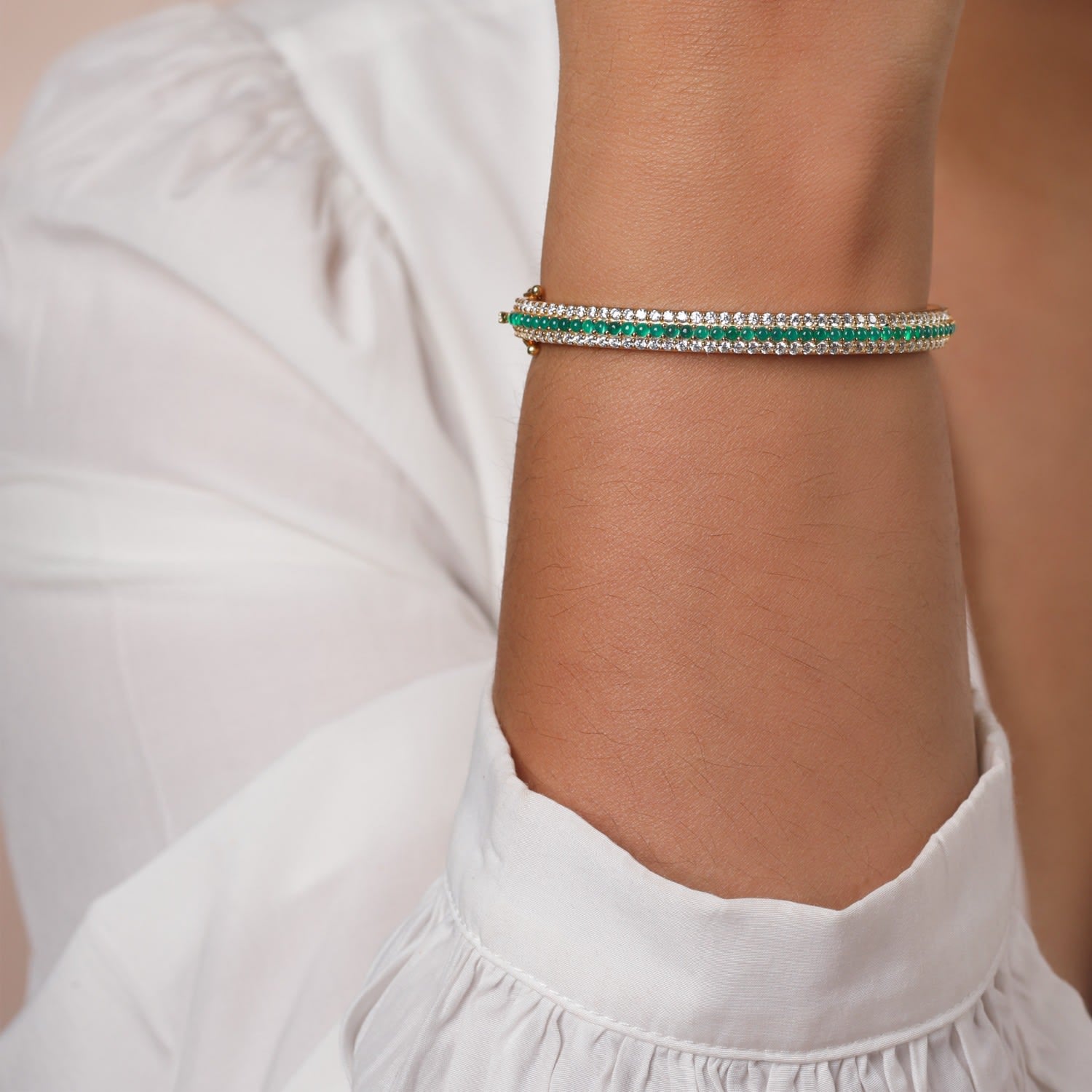 The Summer Sparkle Bracelet - Green Onyx by Preeti Sandhu is a dazzling and alluring accessory. This bangle bracelet is hand-set with shimmering stones and a row of faceted Green Onyx stones. It is expertly handcrafted in 14k gold-plated sterling silver with a 2-micron plating.