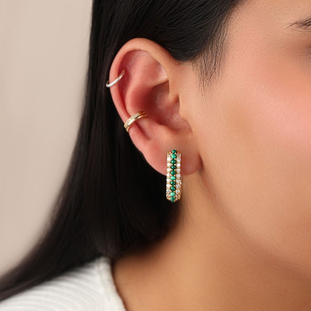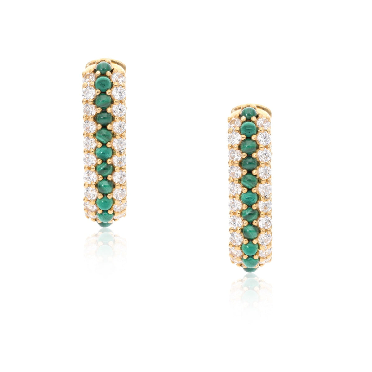 These hoop earrings are handcrafted from sterling silver with a 2-micron thick gold plating. They are encrusted with malachite and high-quality zirconia.