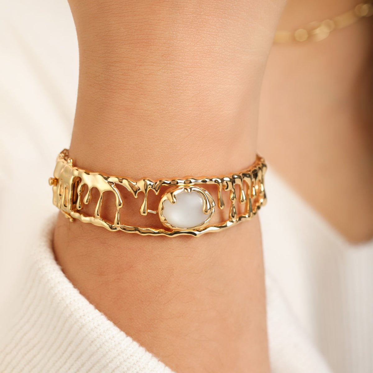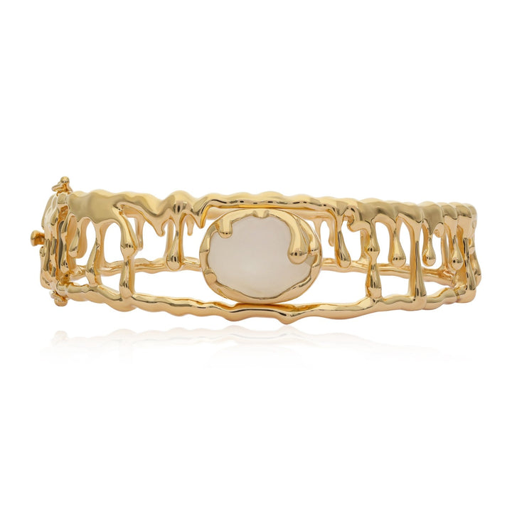 The Selena Moonstone Cuff Bracelet by Preeti Sandhu is a warm and glowing representation of nature. Handcrafted from 14k gold-plated sterling silver, its unique, molten silhouette illustrates flowing, glossy magma adorned with a stunning oval-shaped moonstone. It styles effortlessly with any ensemble and is perfect for adding a touch of bold elegance.