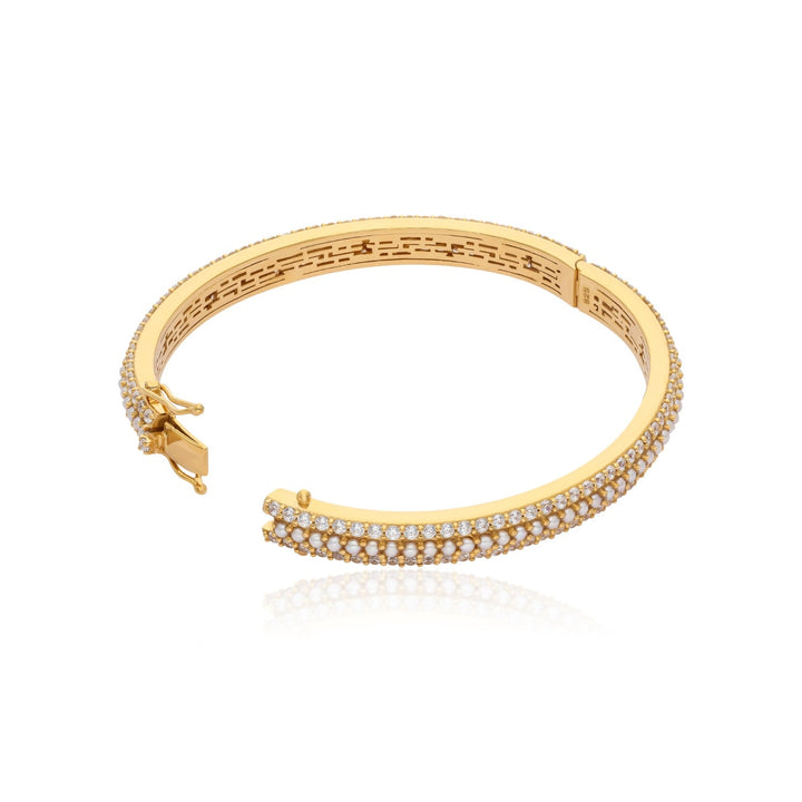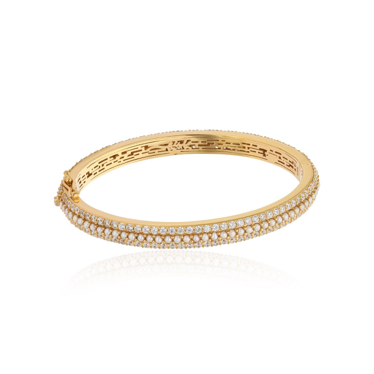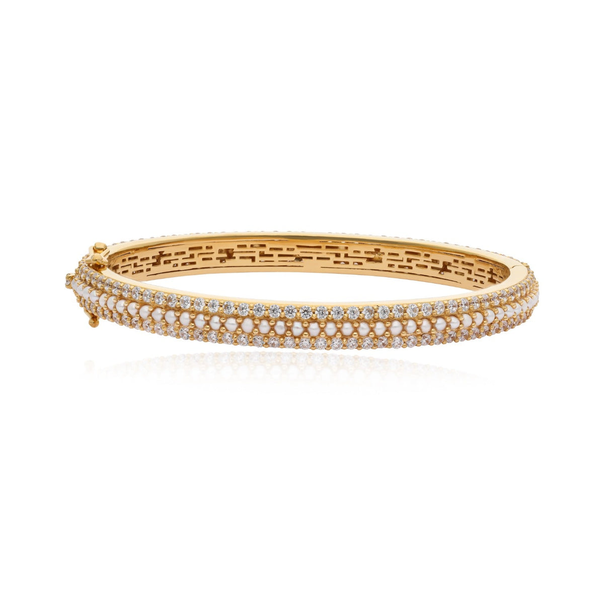 This bangle bracelet is handcrafted in 14-karat gold-plated sterling silver with a 2-micron plating. It is set with crystals and freshwater pearls. It features a box clasp with safety latches and is available in four sizes.