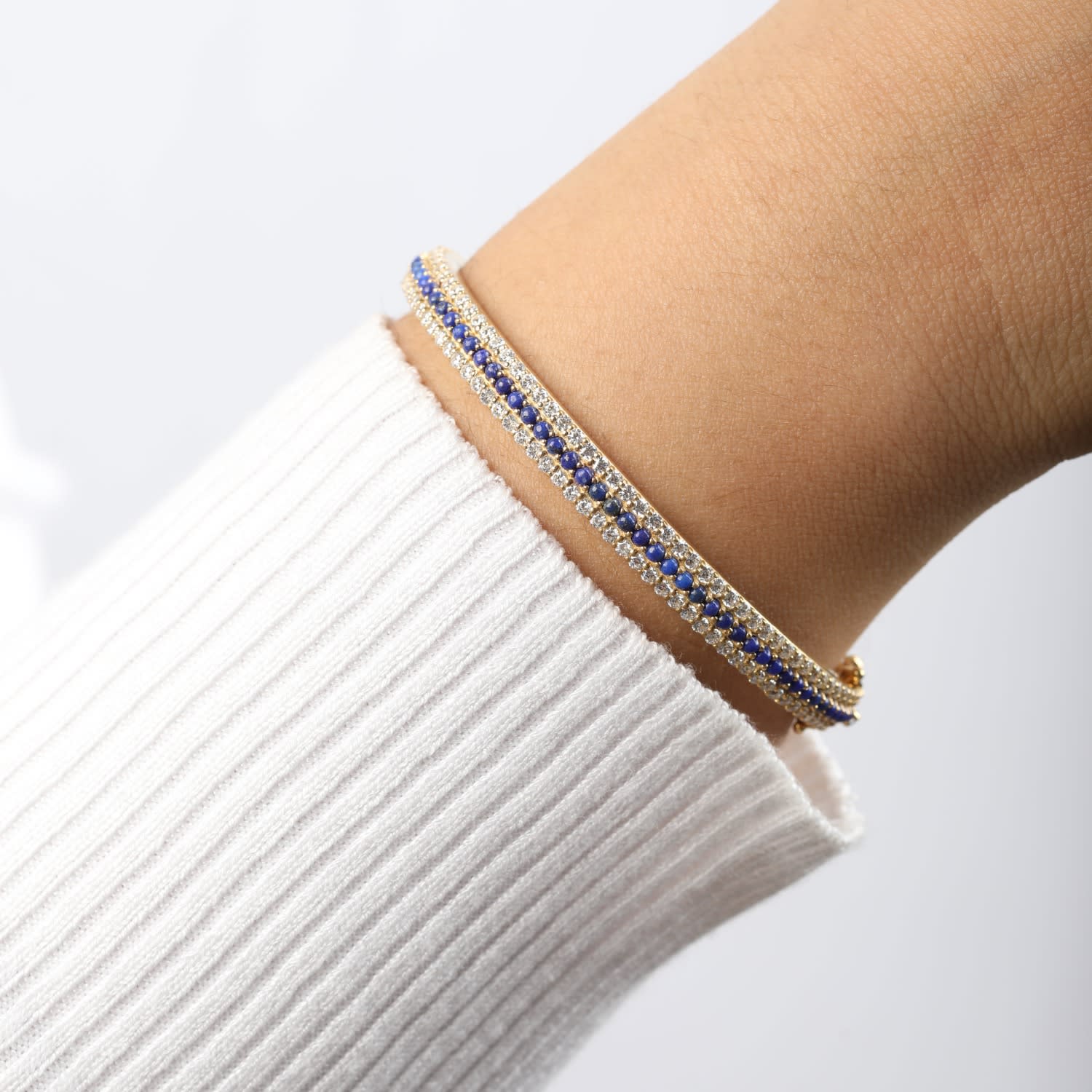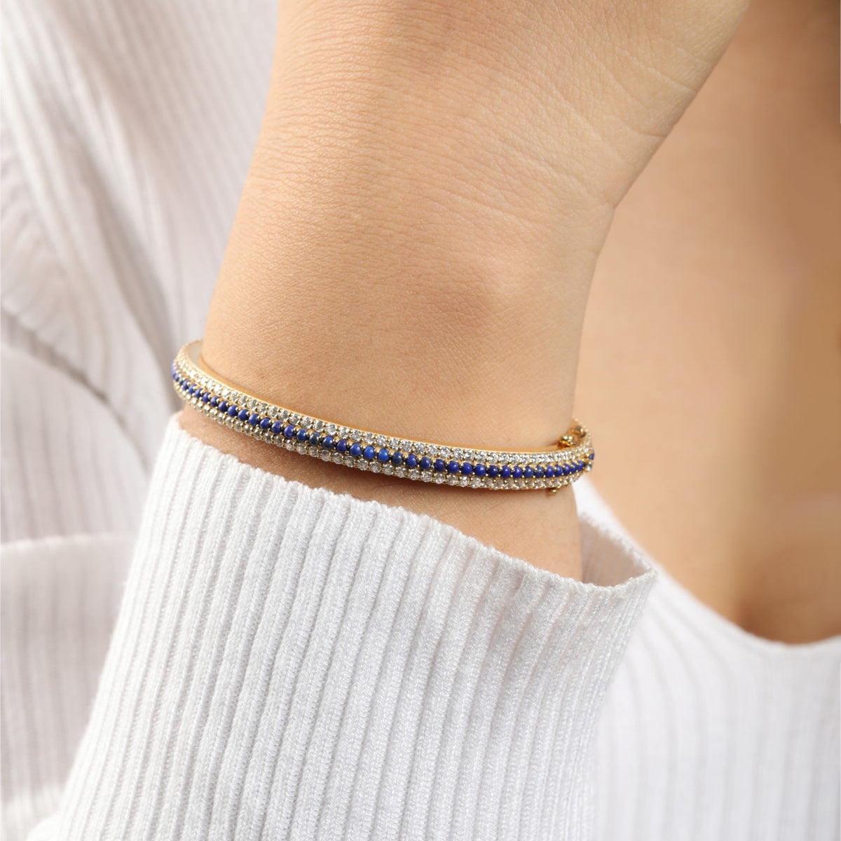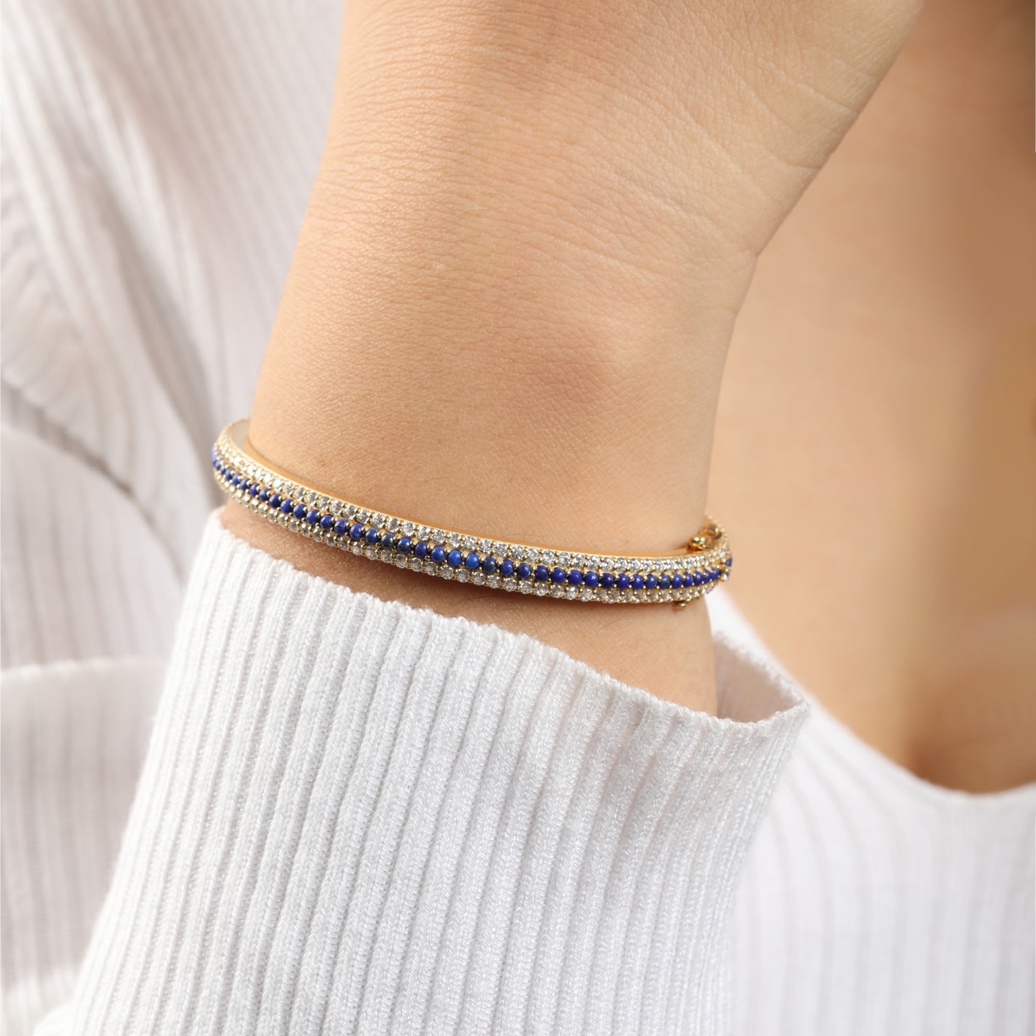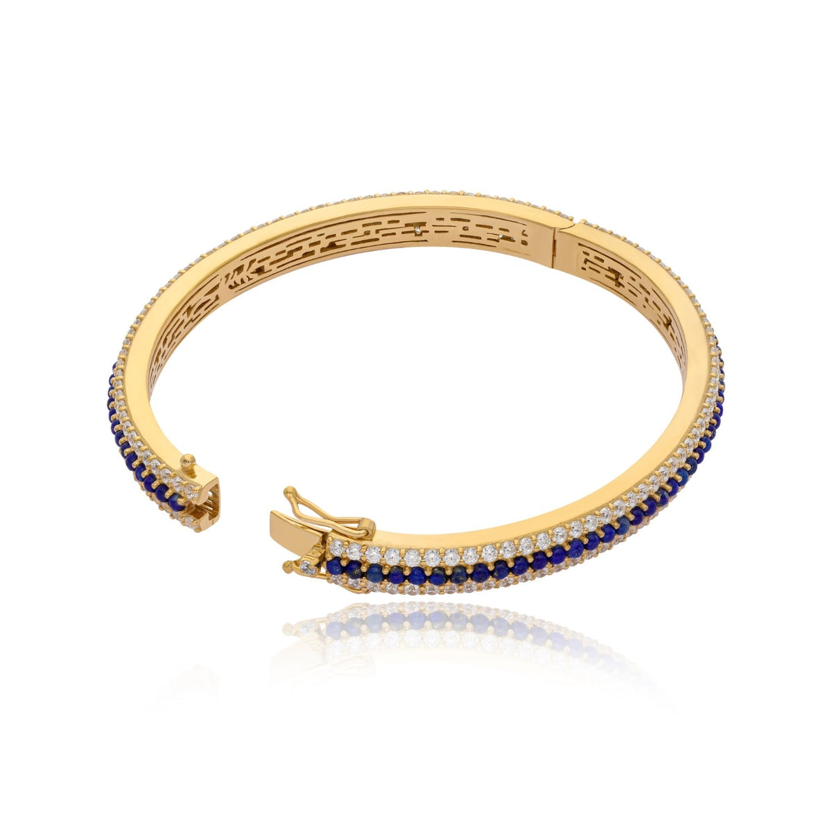 This bangle bracelet is expertly handcrafted in 14-karat gold-plated sterling silver with a 2-micron plating. It is set with lapis lazuli stones and other shimmering stones. It is available in X-small, Small, Medium, and Large.