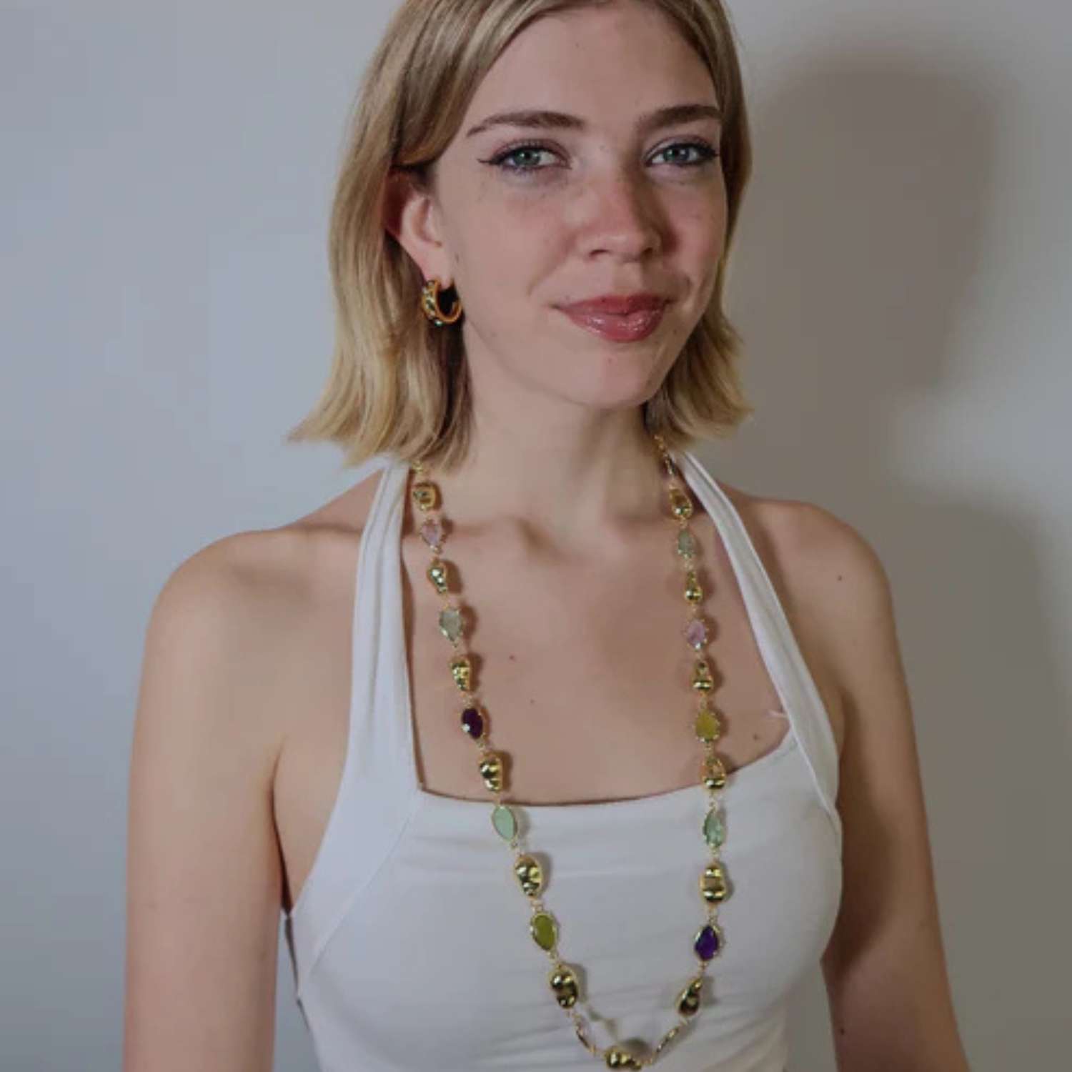 The Diana's Winter Necklace by Recreation Jewels is a masterpiece of rarity and elegance. This exquisite, 40-inch-long necklace is adorned with a captivating selection of gemstones, including amethyst, green fluorite, blue crystal, red jade, and lemon jade. Complemented by gold-plated brushed beads, this necklace adds a vibrant array of colors to any outfit.