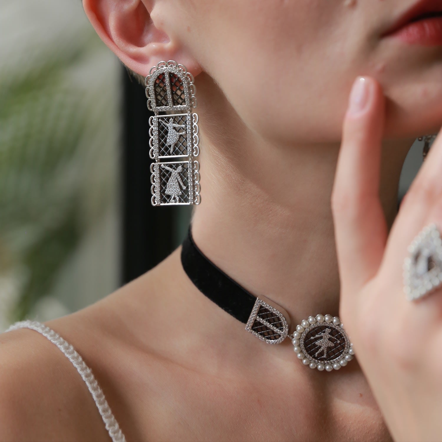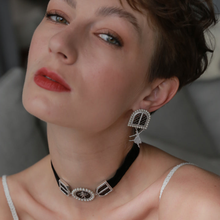 This Black Nutcracker Choker by Retro Chic is a beautiful piece from the Edwardian Period Royal Ballet Collection. The gold-plated brass choker is set with Cubic Zirconia and Mother-of-Pearl, creating an elegant and classic look. The intricate design and sophisticated materials make it a perfect accessory to elevate any outfit.