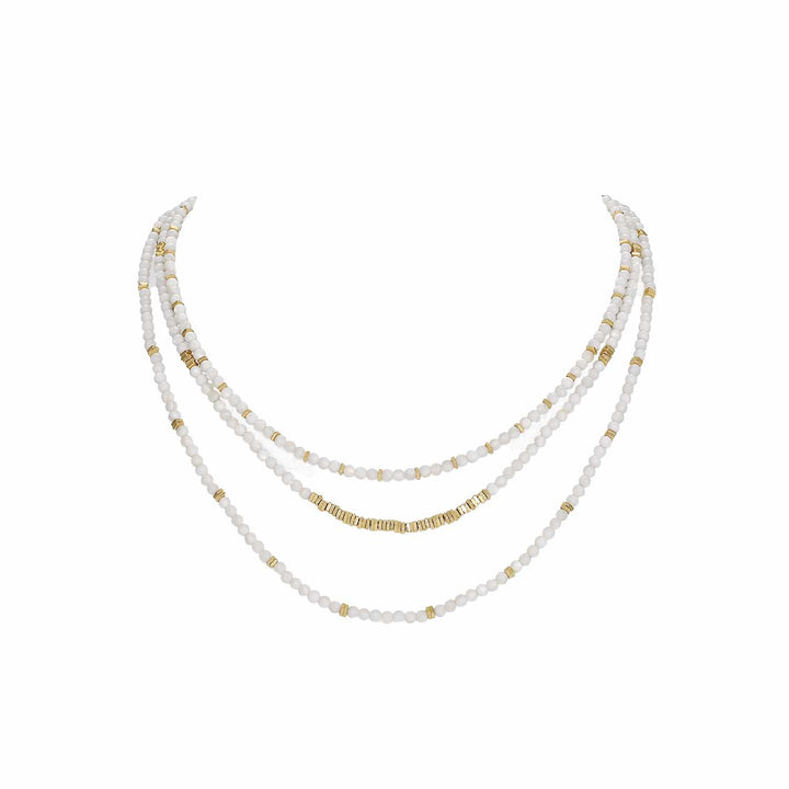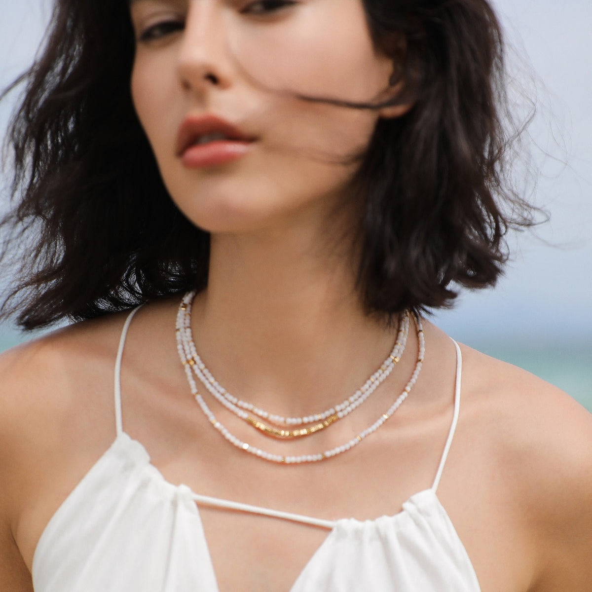 This necklace is made with gold-plated brass and white shell beads. It is a part of the Aegean Coast Collection.