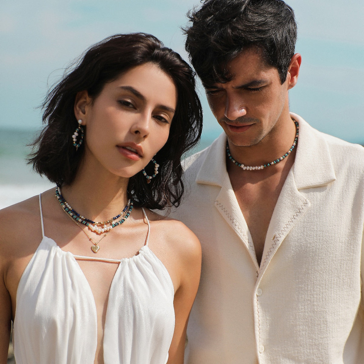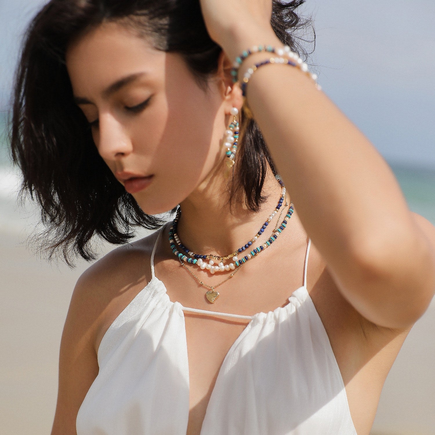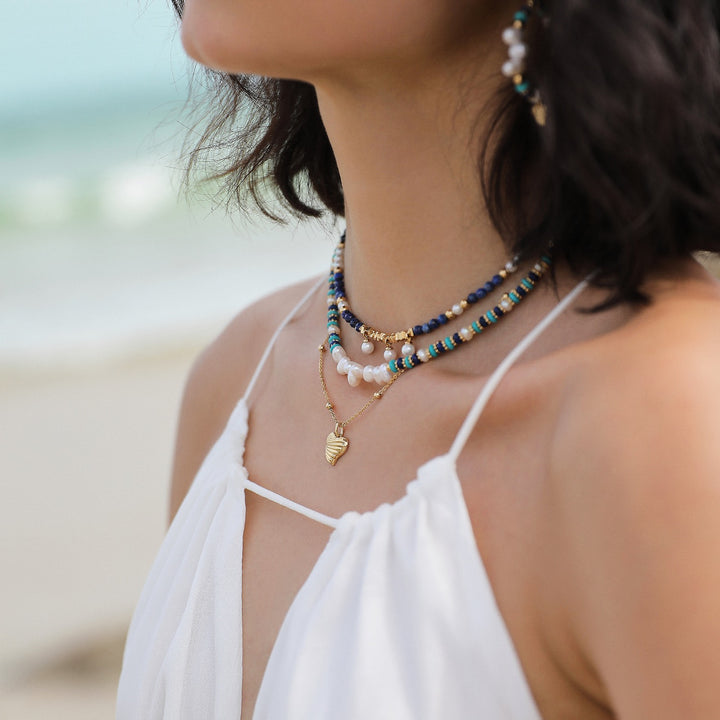 The Ocean Lover Necklace Set by Retro Chic is a beautiful and bohemian-inspired set. Inspired by the Aegean coast, this gold-plated brass set features natural stones like lazurite, turquoise, and shell pearls. The combination of colors and materials creates a magnificent sun-kissed look that's perfect for a seaside style.